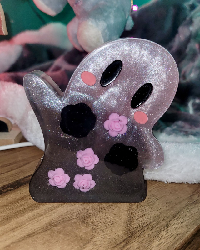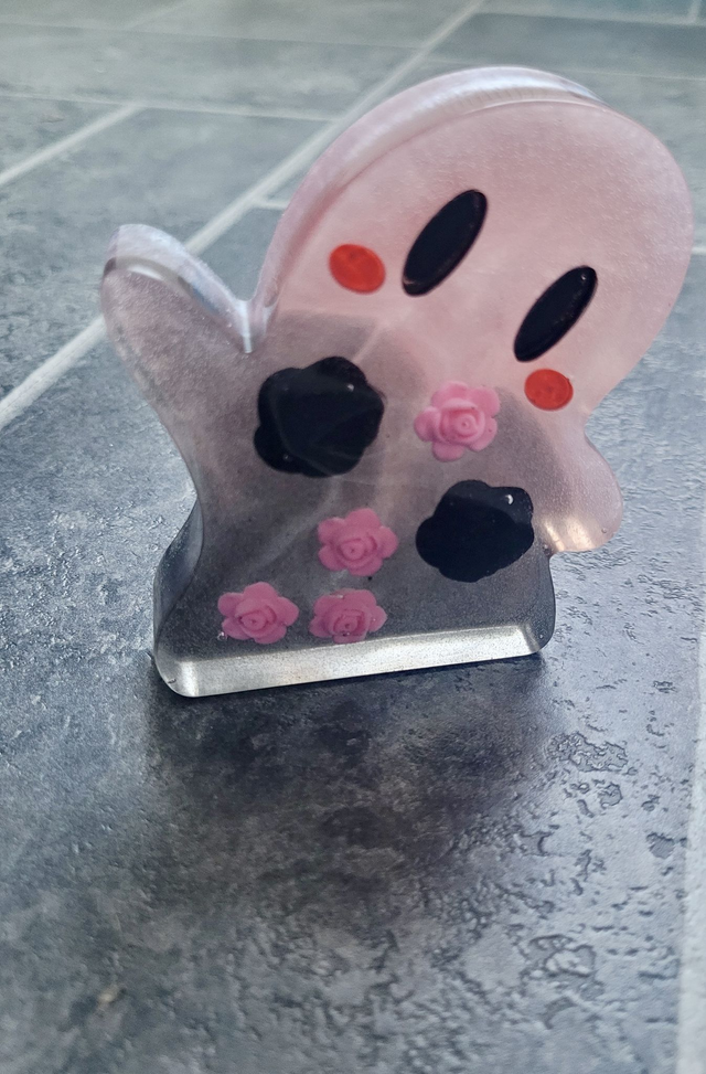 This handmade resin ghost ornament is a soft gothic dream, featuring a pale pink and black shimmer blend, embedded pink and black flower charms, and hand painted face details. Each piece is individually poured, decorated, and finished by hand, making this ghost completely unique - only one of this design available.
