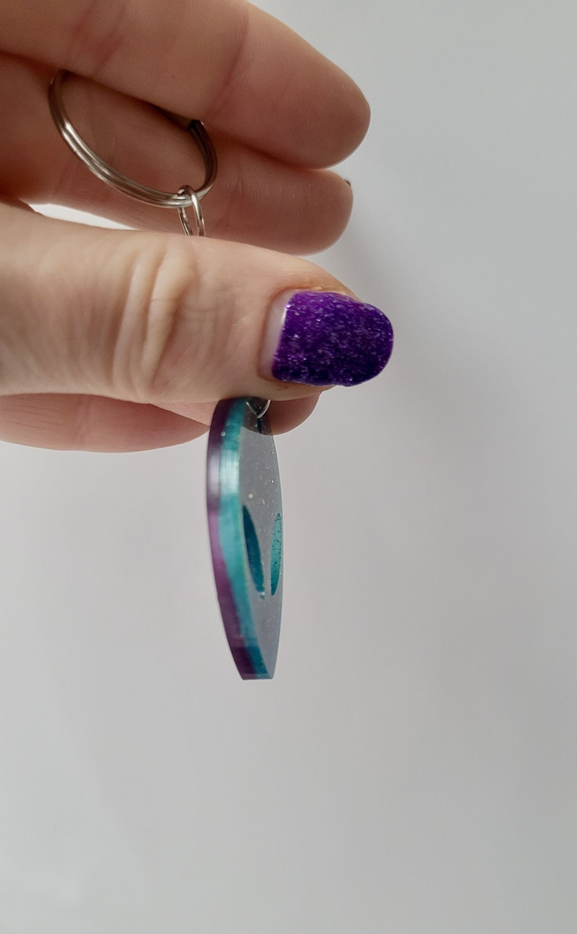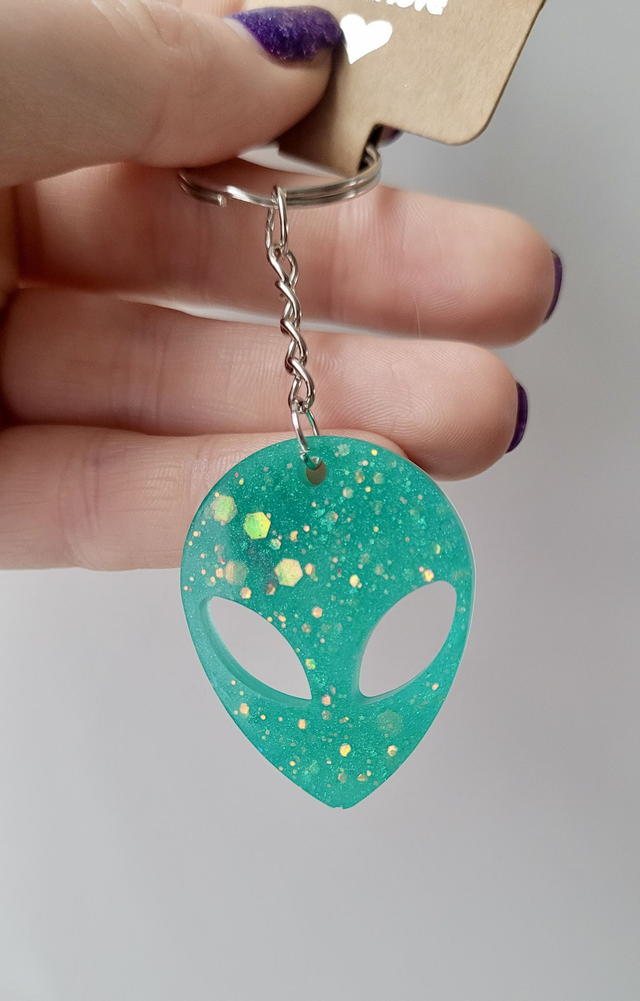 Add a cosmic twist to your everyday with these handmade alien head resin keyrings! Each one is poured, glittered, and finished by hand, making them totally unique. Choose from bold glitter finishes or request a custom colour.