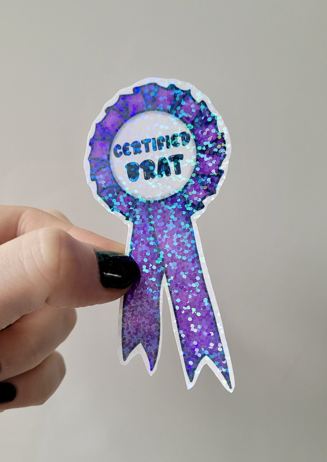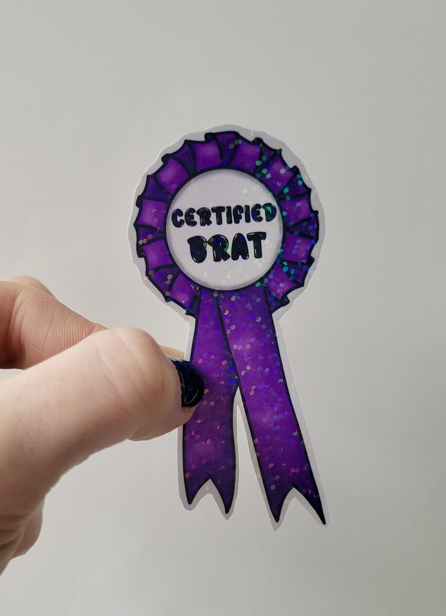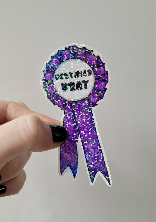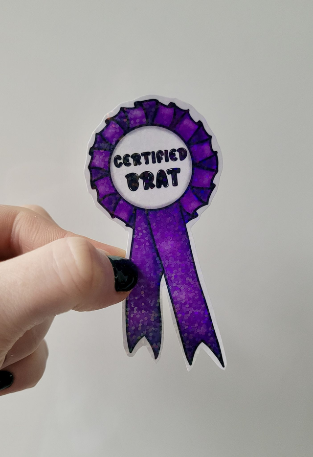 A bold badge of brat honour! This vinyl sticker features a purple ribbon rosette design with “Certified Brat” in bubble lettering, topped with sparkly holographic glitter overlay.
