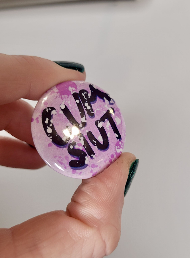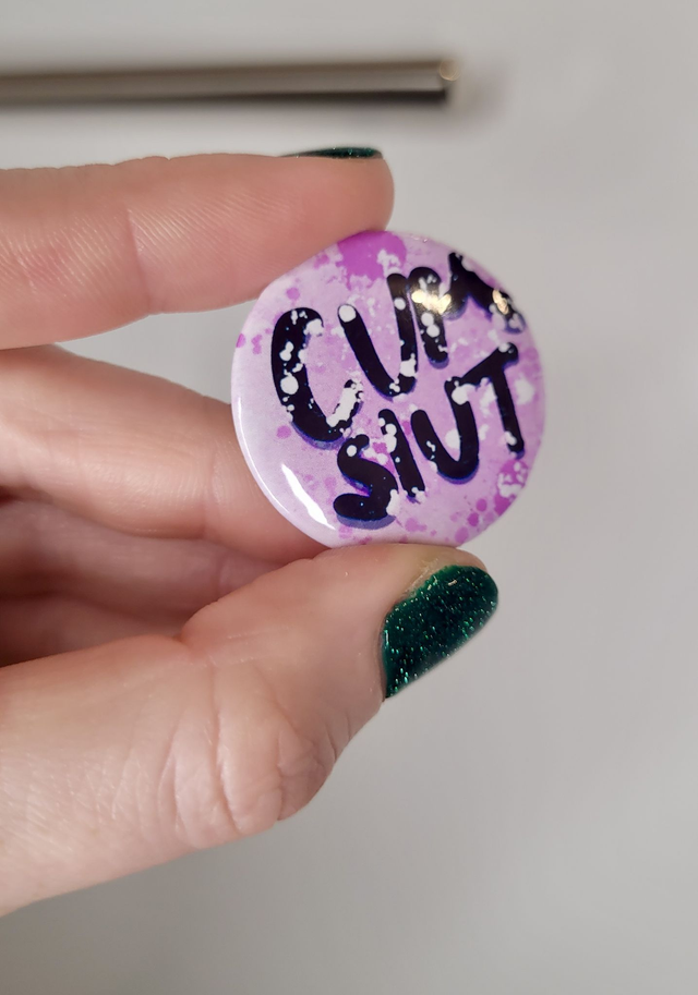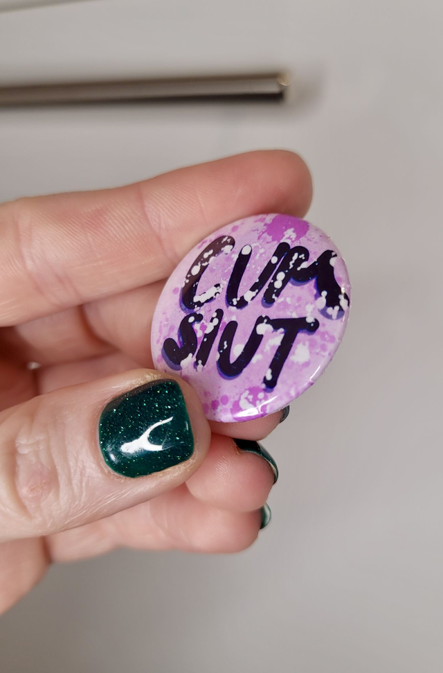Make a bold statement with this NSFW badge featuring the phrase “Cum Slut” in punchy black lettering on a dreamy purple-pink splatter background. This round 32mm button pin is a cheeky, tongue-in-chic accessory for alt fashion lovers, proudly kinky folks, and unapologetically spicy beings. A glossy finish and safety pin back make it perfect for accessorising jackets, bags, hats, or lanyards.
