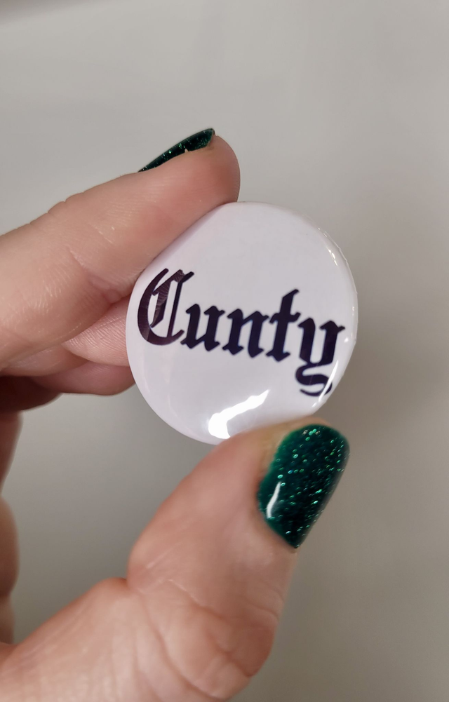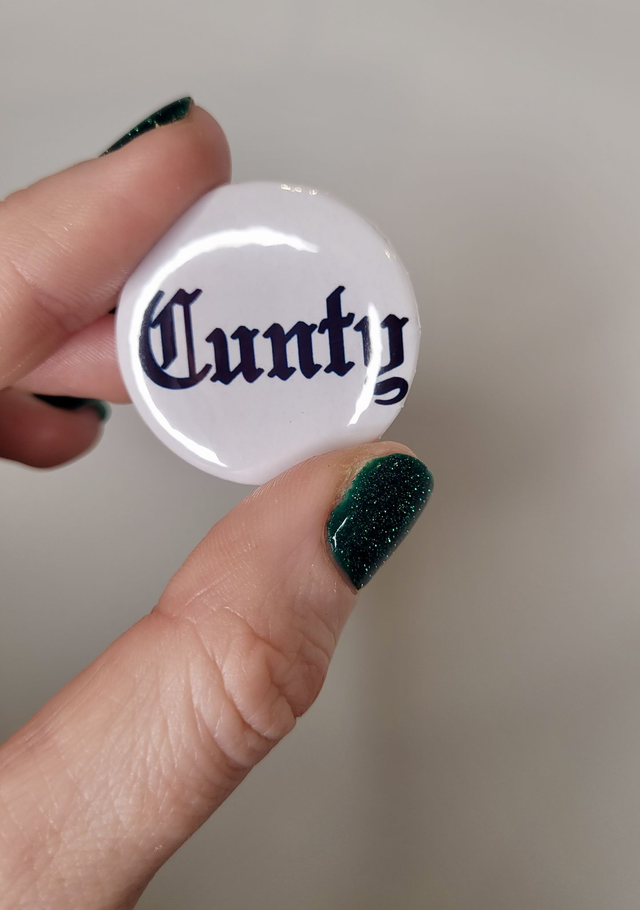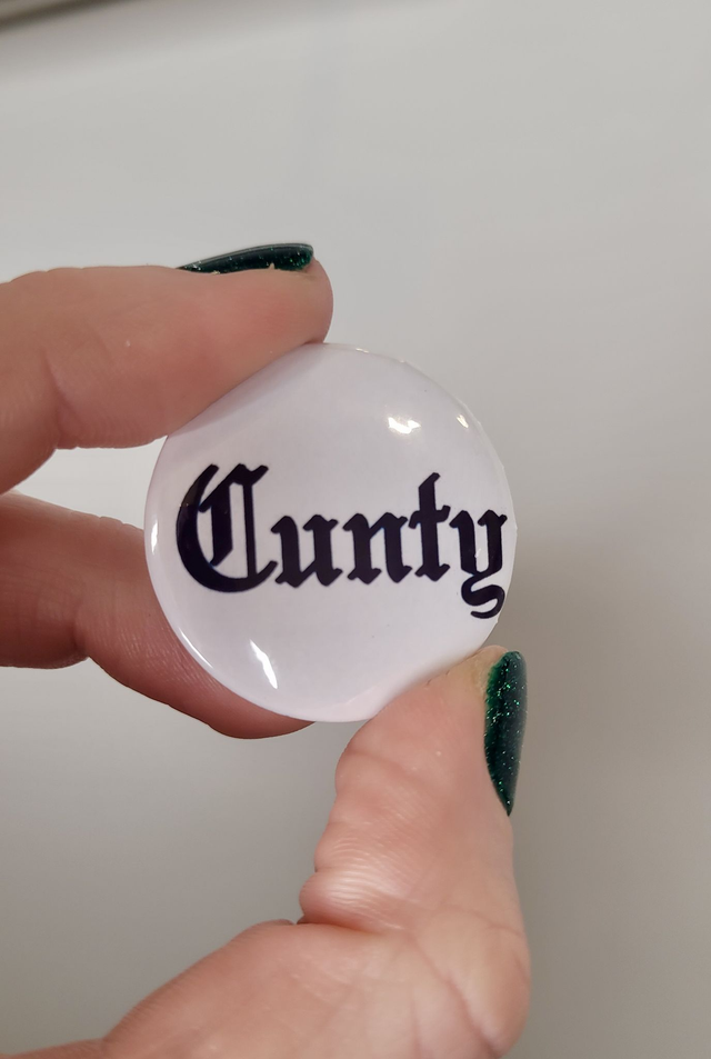 Say it with your chest – or your jacket, bag, or lanyard! This 32mm glossy pinback badge features the word “Cunty” in bold old English lettering, perfect for unapologetic queers, alt babes, and spicy personalities. Whether you’re reclaiming language, making a statement, or just love a bit of tongue-in-cheek flair, this badge adds edge and sass to any outfit.
