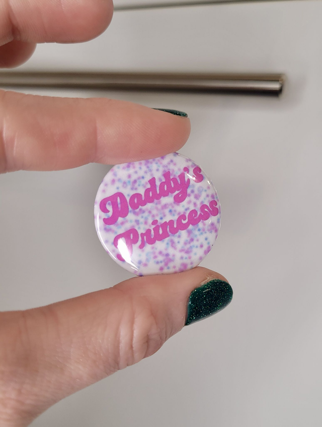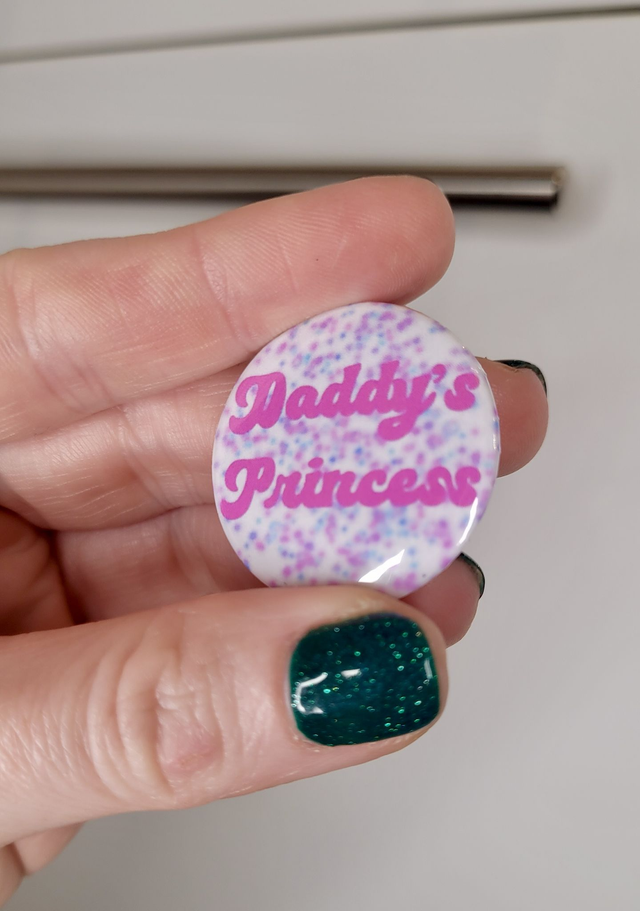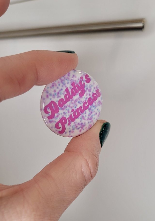 Add a playful pop of personality to your outfit with this handmade “Daddy’s Princess” badge. Featuring pink text on a pastel speckled background, this button-style pin is a cheeky accessory.
