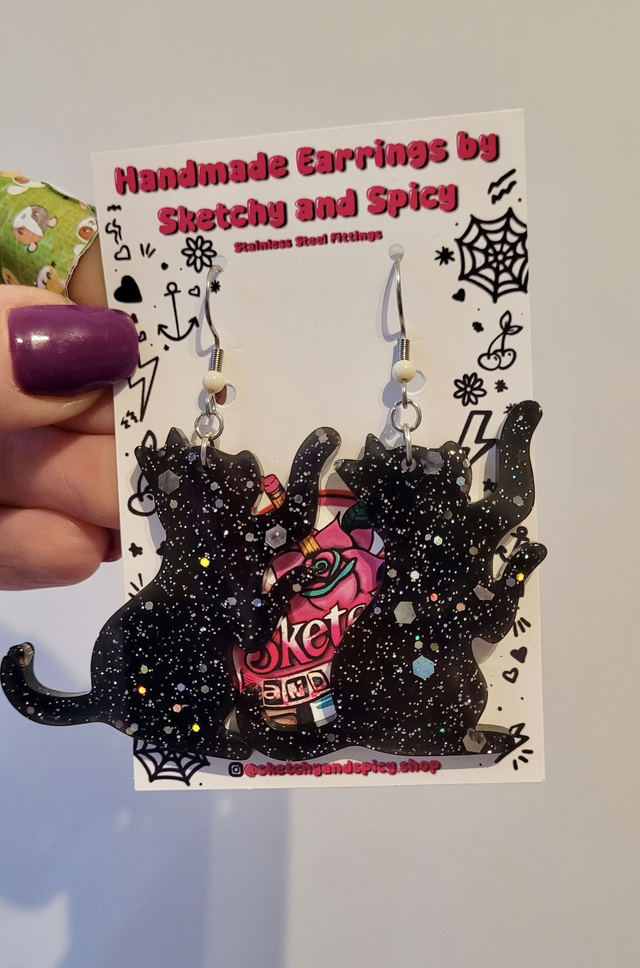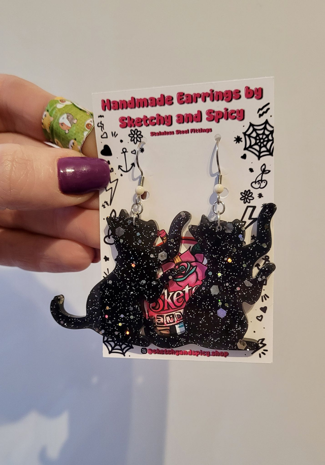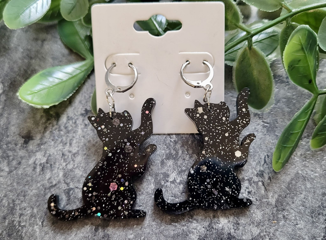These playful black cat earrings are handmade with glittery resin, featuring silver and holographic sparkle that catches the light. Each earring shows a playful cat silhouette, perfect for alt fashion lovers, spooky season styles, or cat enthusiasts. Fitted with stainless steel lever-back hoops or hooks, for comfort and security.