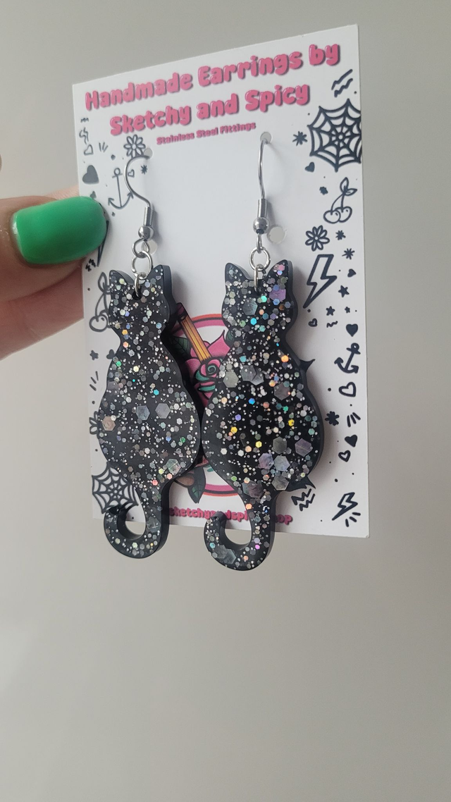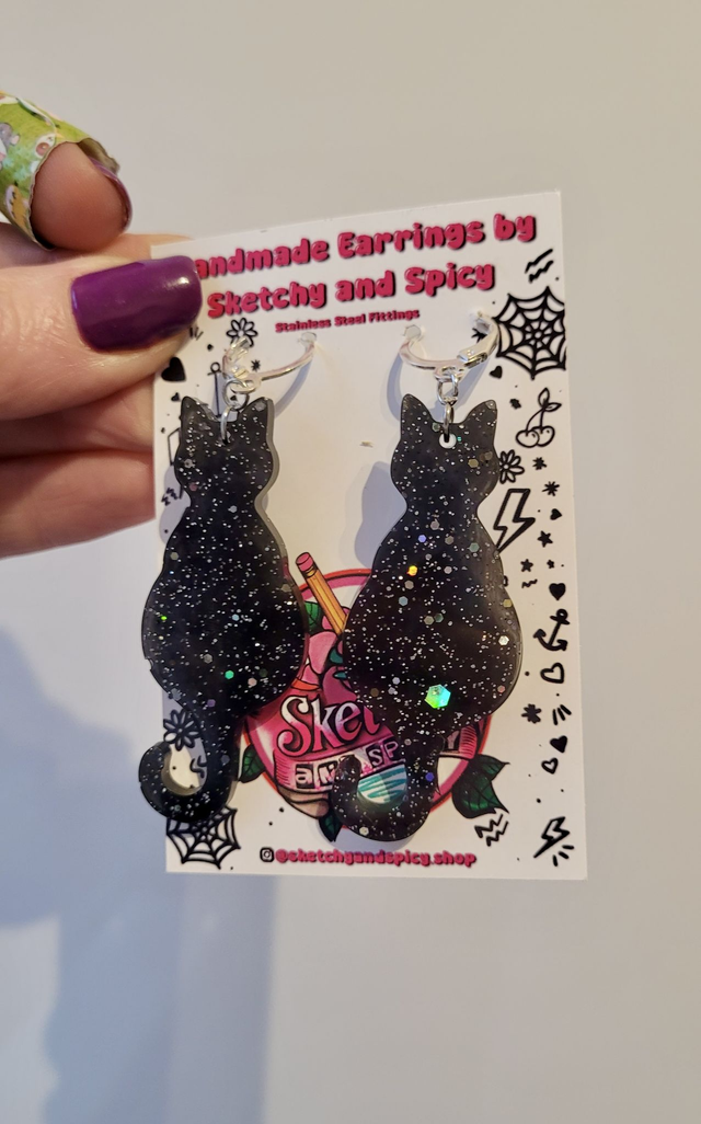 These handmade sitting cat earrings are created from black resin with silver and holographic glitter for a starry night effect. Featuring a sleek, simple silhouette, they’re perfect for lovers of cats, gothic fashion, or celestial vibes. Choose stainless steel lever back hoops fitting or shepherd hooks fitting.