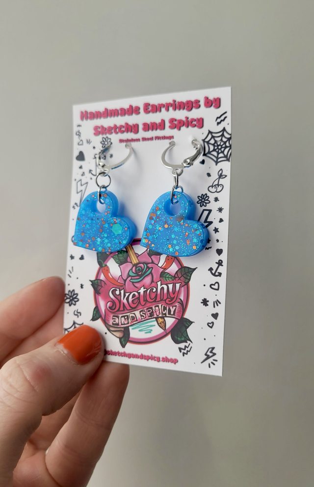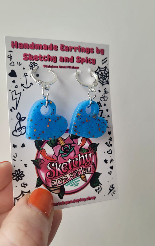 These handmade earrings feature chunky bright blue resin hearts with colourful glitter details, perfect for adding bold sparkle to your outfit. Each pair is fitted with stainless steel lever-back closure hoops – secure, hypoallergenic, and comfy enough for everyday wear.