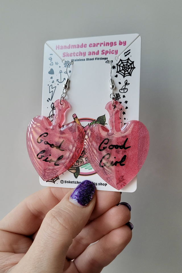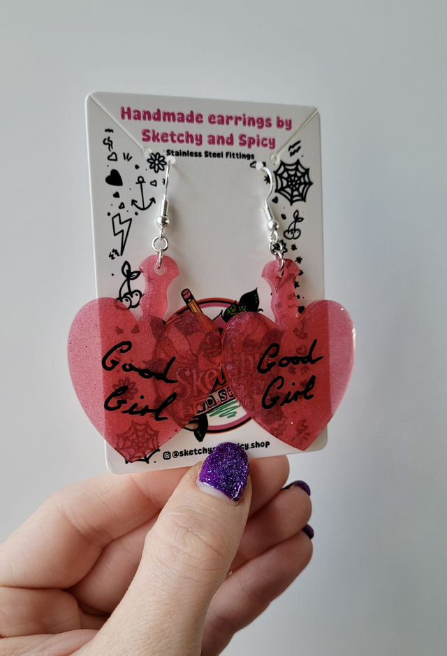 Make a bold statement with these handmade “GOOD GIRL” earrings, crafted from cherry red shimmer resin and finished with black handwriting text. These heart-shaped paddle earrings are lightweight, cheeky, and full of sweetness.