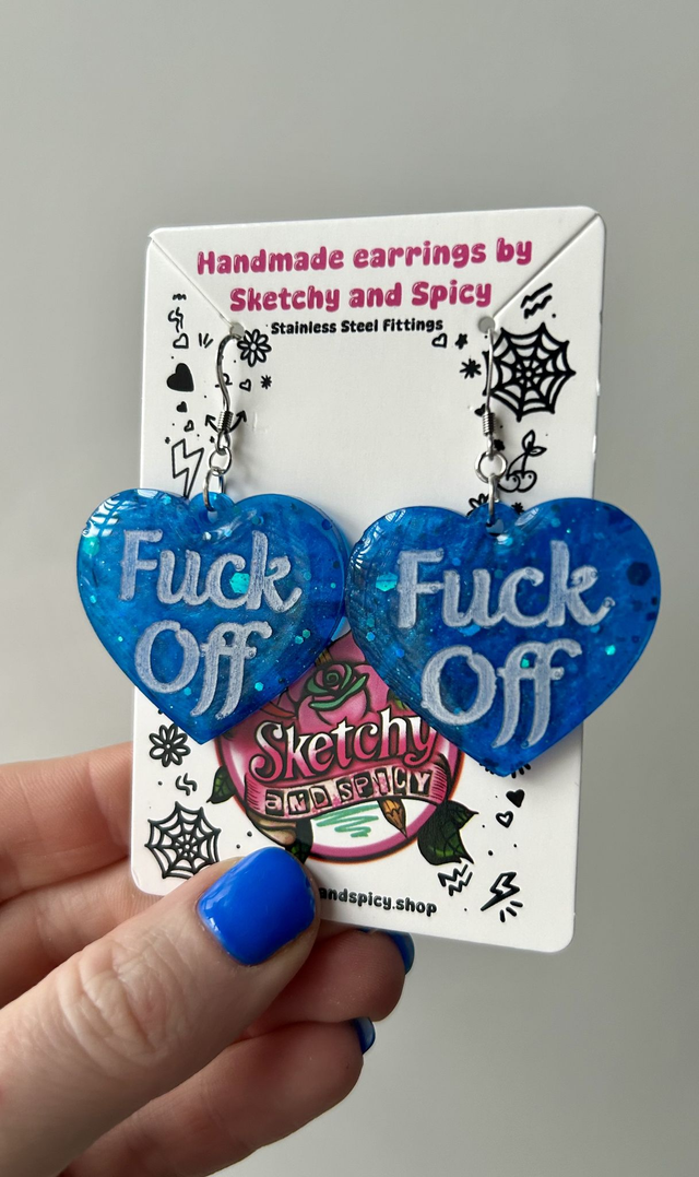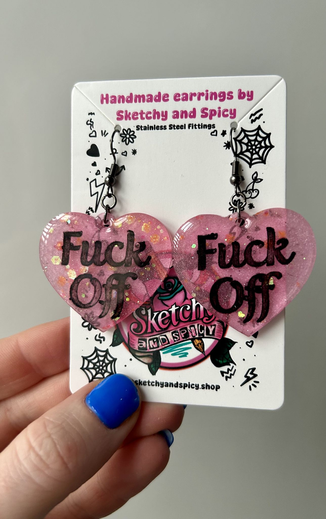 Handmade resin heart earrings featuring bold “Fuck Off” lettering in glitter resin. Cheeky, unapologetic statement earrings with an alternative edge.