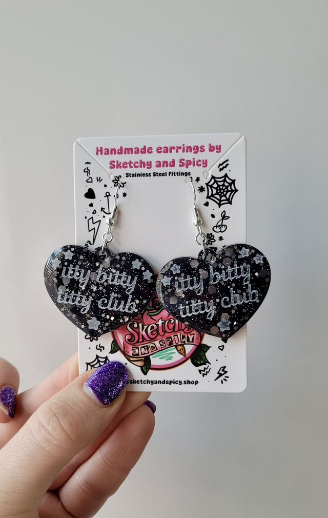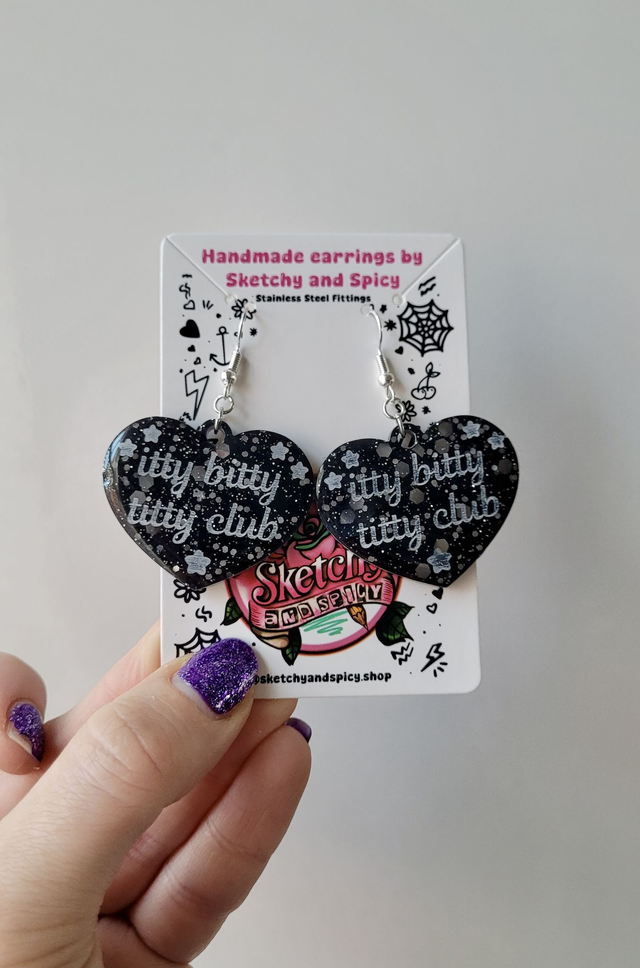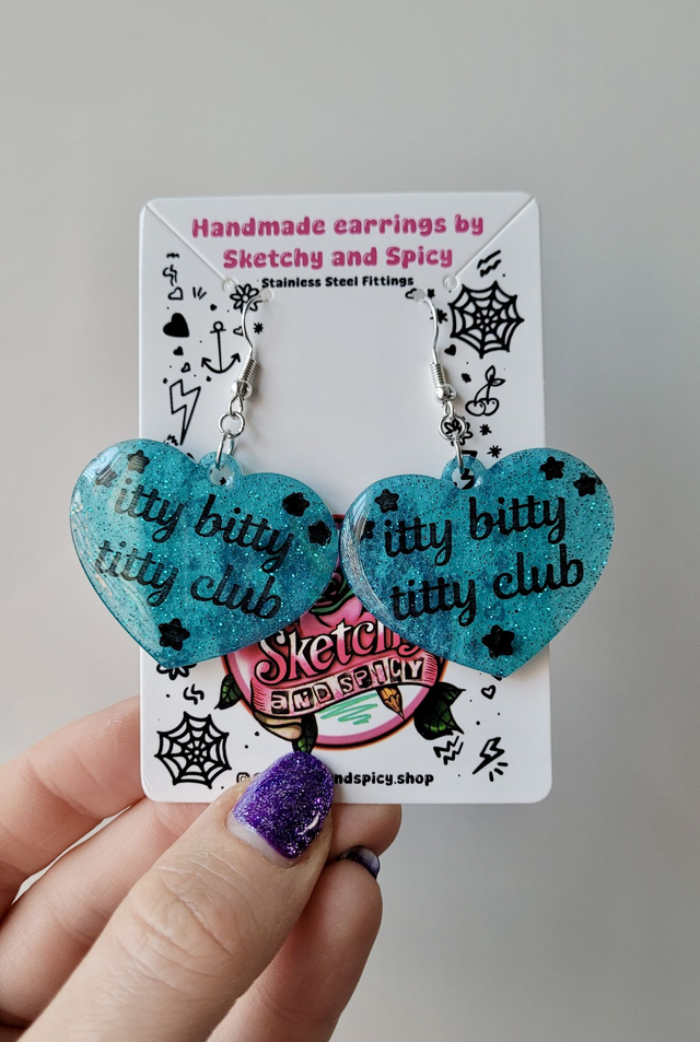 Handmade resin heart earrings featuring the slogan “itty bitty titty club” in glitter-filled resin. Lightweight, bold, and fun statement earrings.