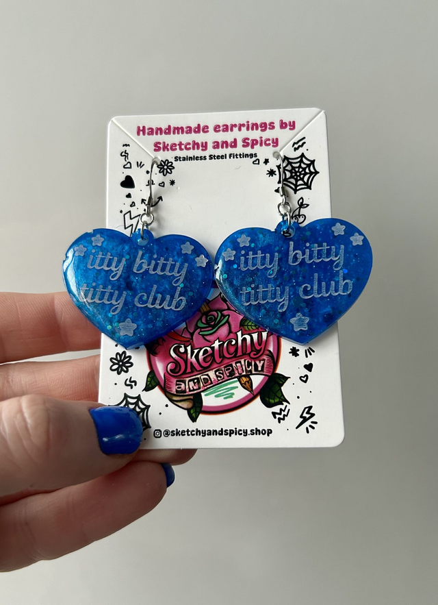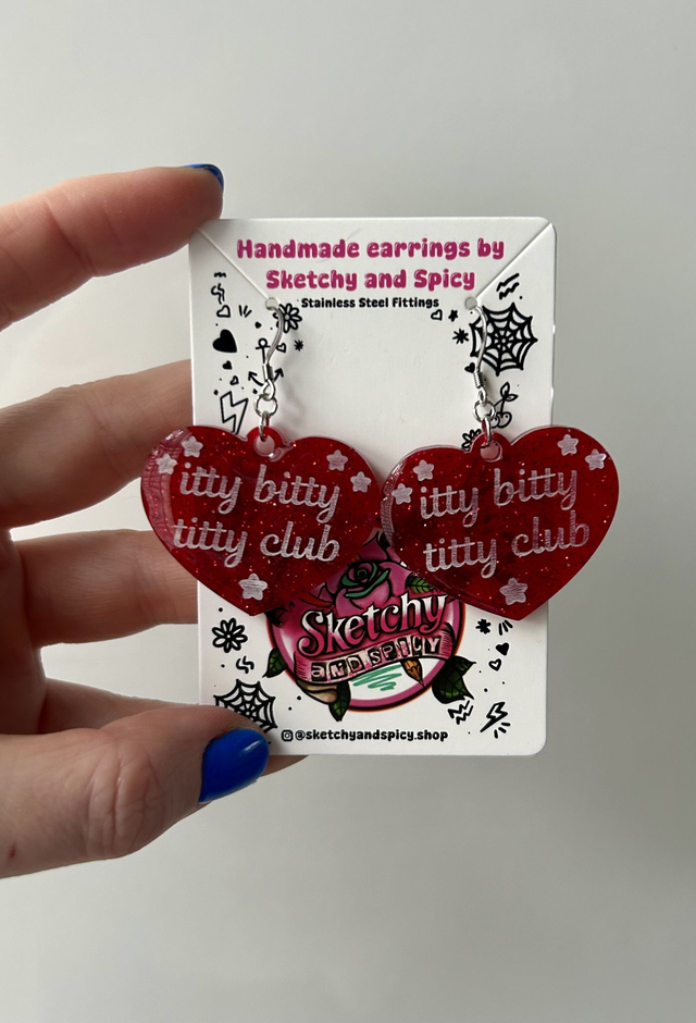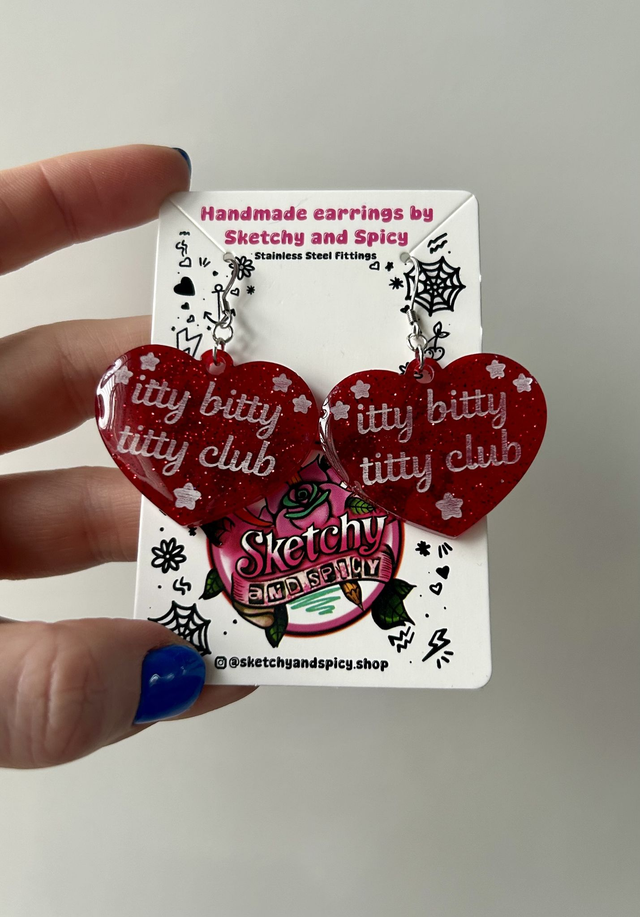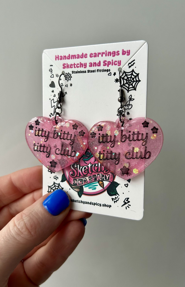 Handmade resin heart earrings featuring the slogan “itty bitty titty club” in glitter-filled resin. Lightweight, bold, and fun statement earrings.