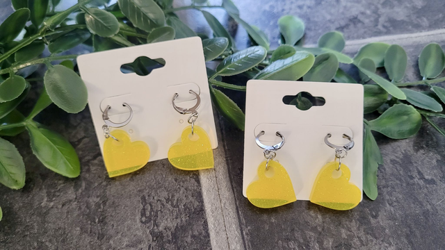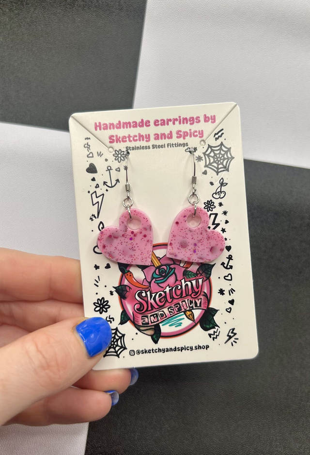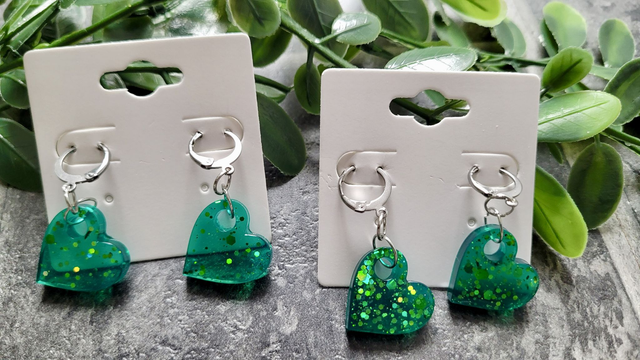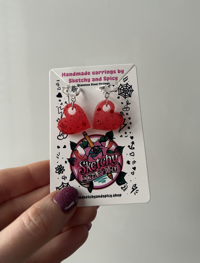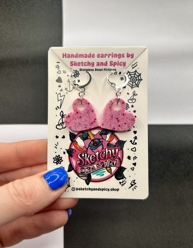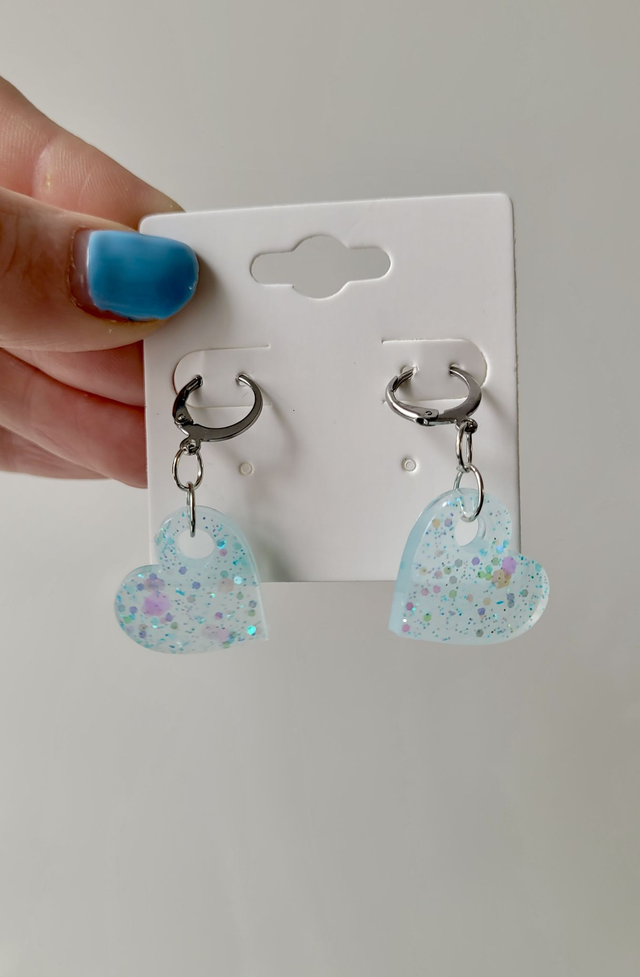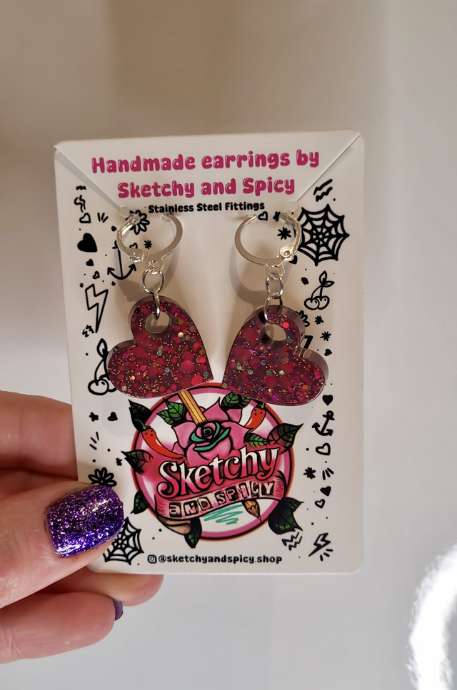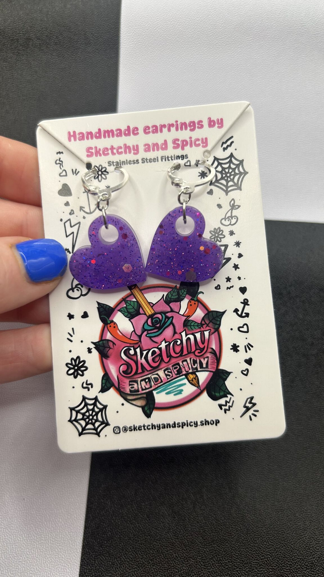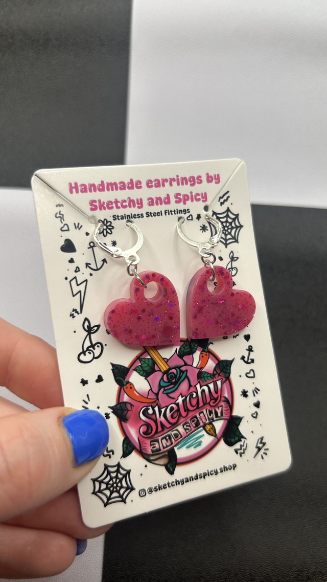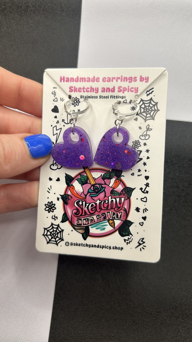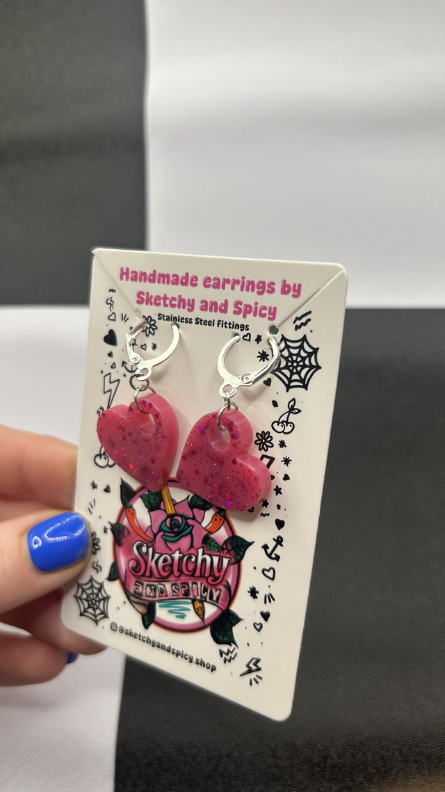 Handmade glitter heart earrings made from hand-poured resin and finished with stainless steel lever-back hoops or shepherd hook ear wires. Lightweight and comfortable, these statement earrings suit alt, punk, gothic, pretty, and preppy styles.