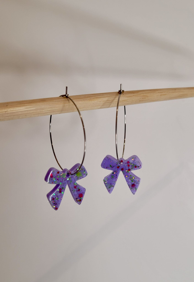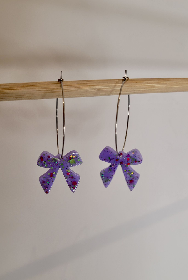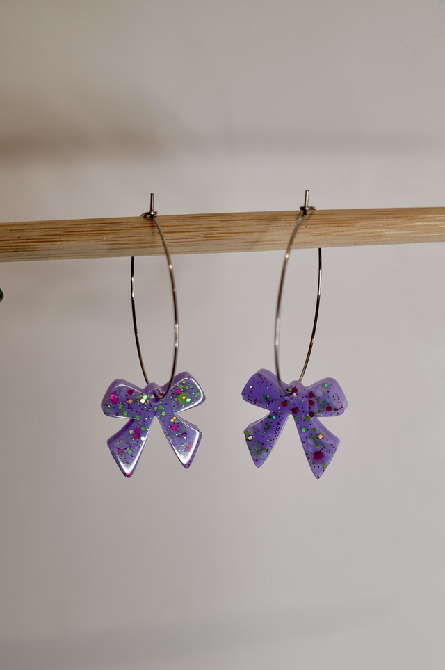 Add some sparkle to your style with these handmade purple bow hoop earrings!