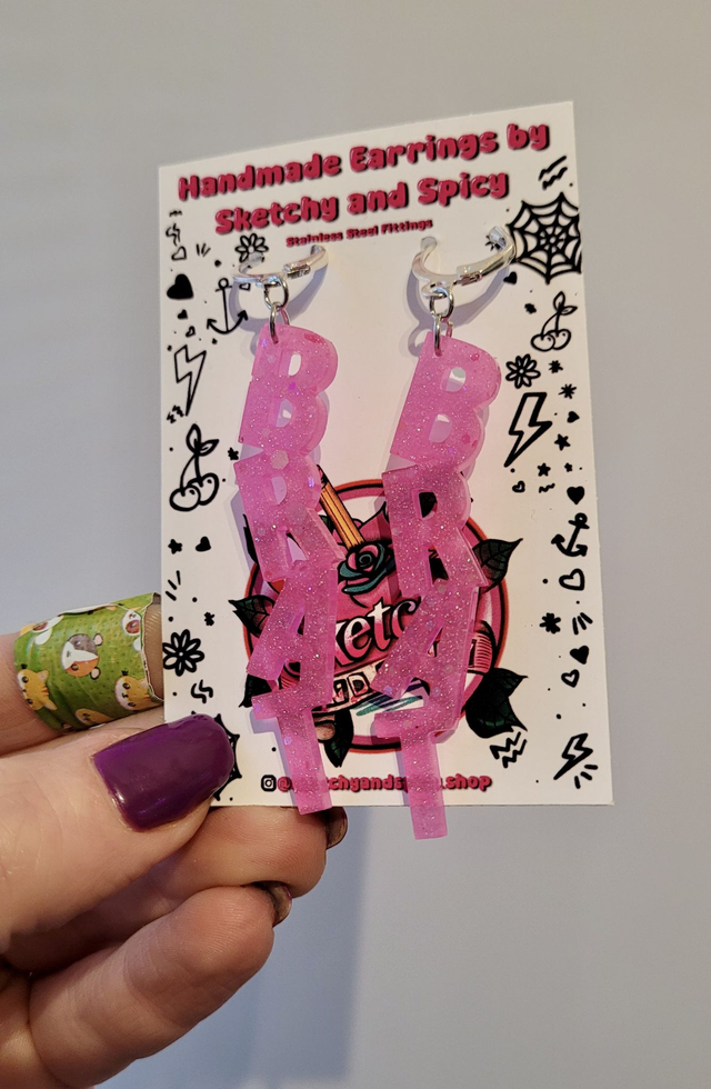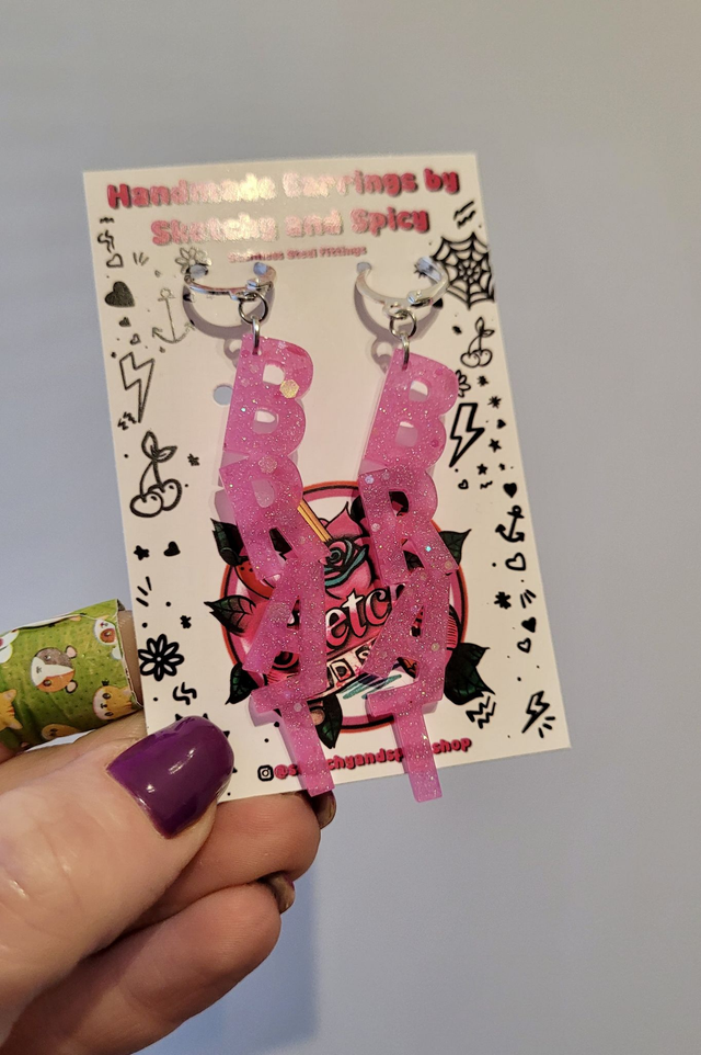 Earrings | Pink Glitter BRAT Earrings | Stainless Steel Lever Back Hoops