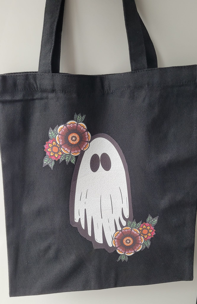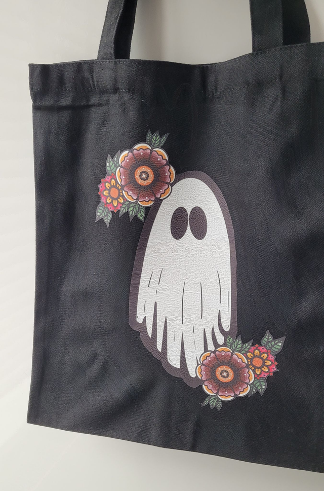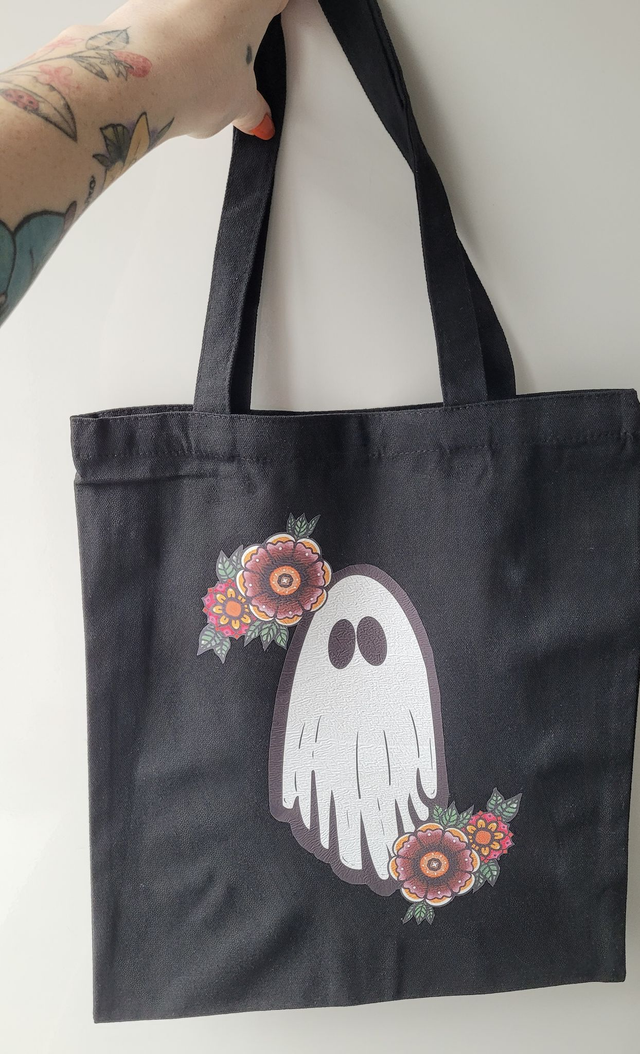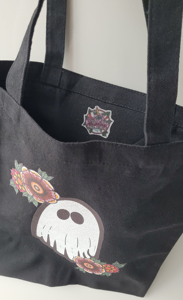 This bold and spooky tote bag features original ghost artwork by Sketchy & Spicy, framed with vibrant traditional tattoo-style flowers. Perfect for lovers of alt fashion, Halloween style, or quirky everyday accessories!