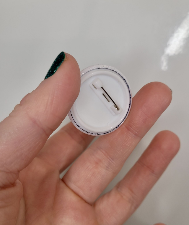 - Glossy finish with secure plastic pin back