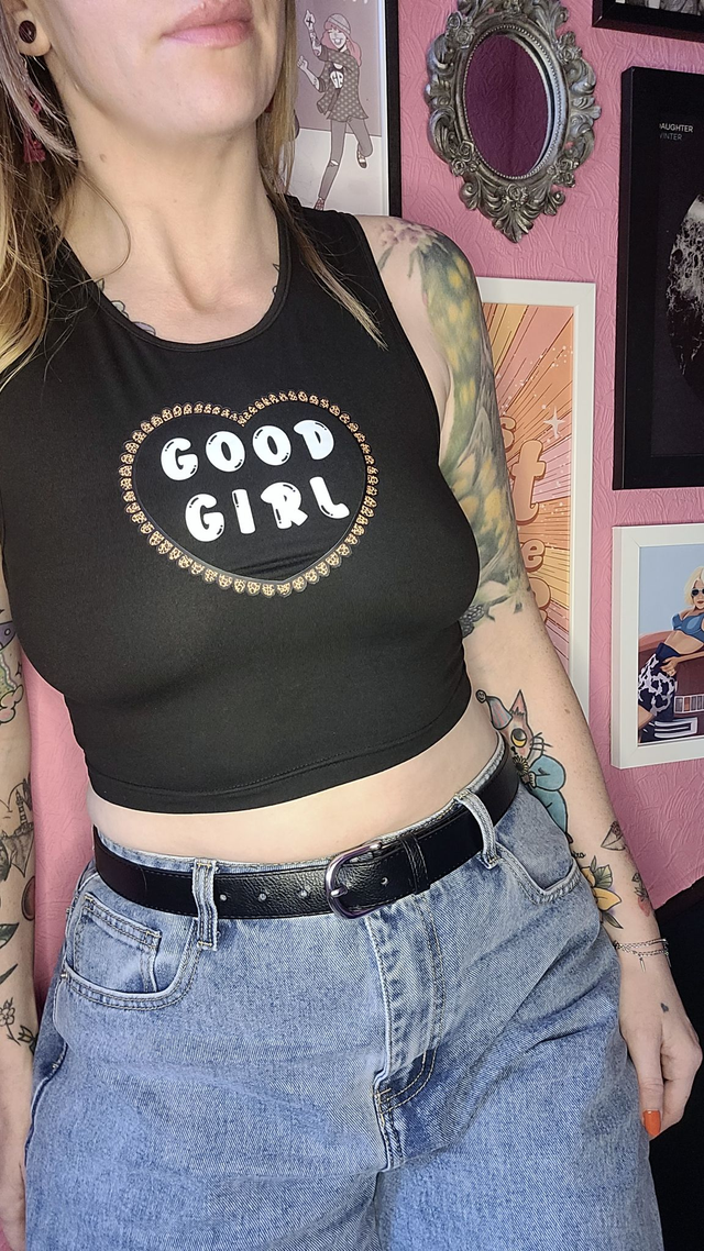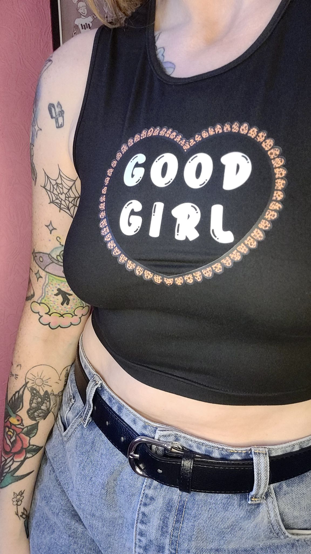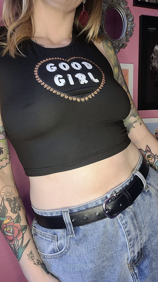 🤎 A bold and cheeky cropped vest top featuring a “GOOD GIRL” heart design. Made from soft, lightweight black polyester with stretch for a close and comfy fit. Ideal for alt fashion lovers and layering up with attitude.