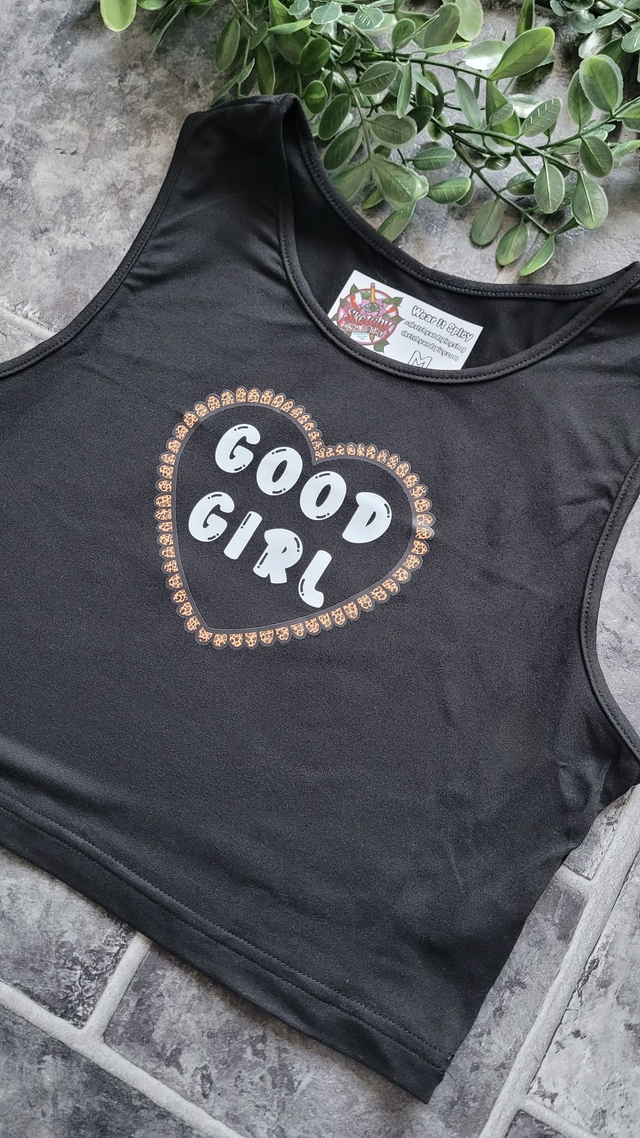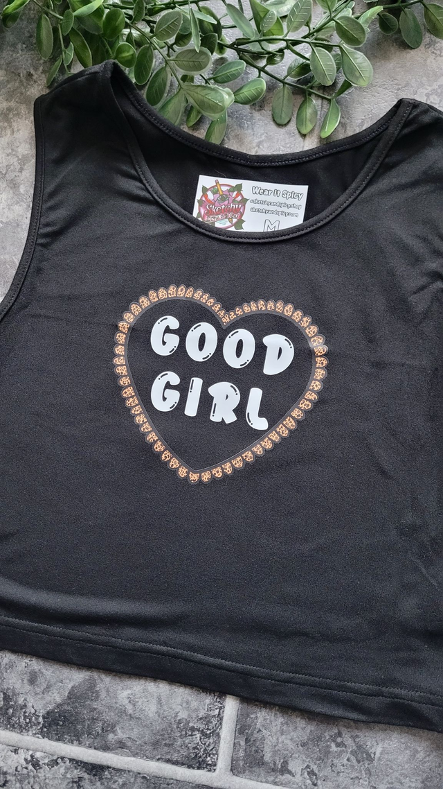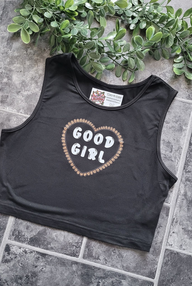 Good Girl Black Crop Vest – Alt Graphic Tank Top with Bold Heart Print | Stretchy Fit Sizes S‑XL