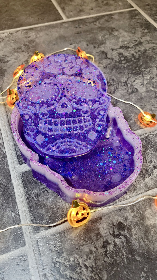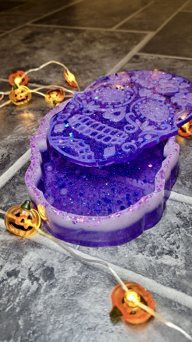 This bold and beautiful handmade trinket box features a classic sugar skull (Calavera) design inspired by Día de los Muertos. Crafted from deep purple resin with shimmery white details, packed with holographic glitter. This skull shaped box is perfect for spooky season or year round alt decor. The detailed skull lid lifts from the lip at the bottom to reveal a spacious storage area for jewellery, coins, crystals, or odds and ends.