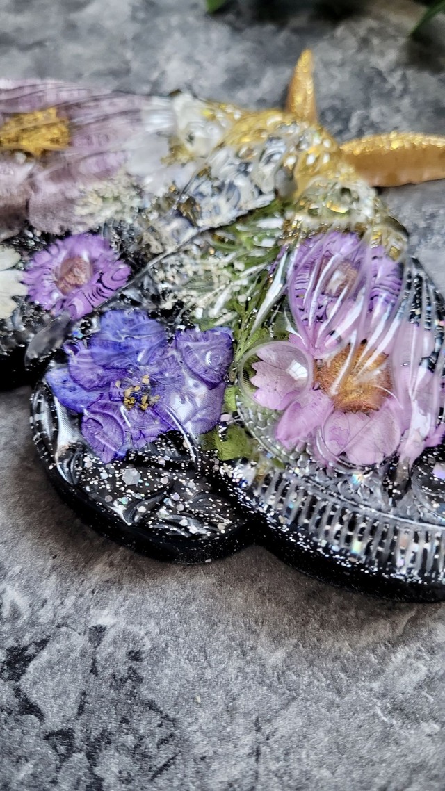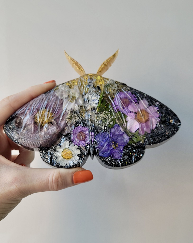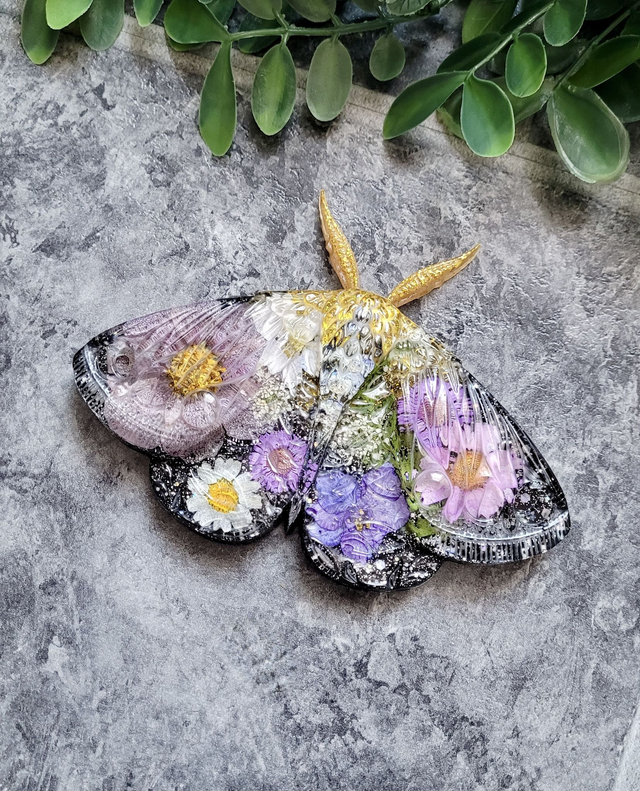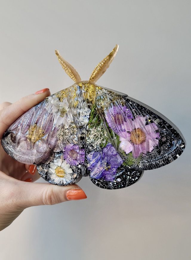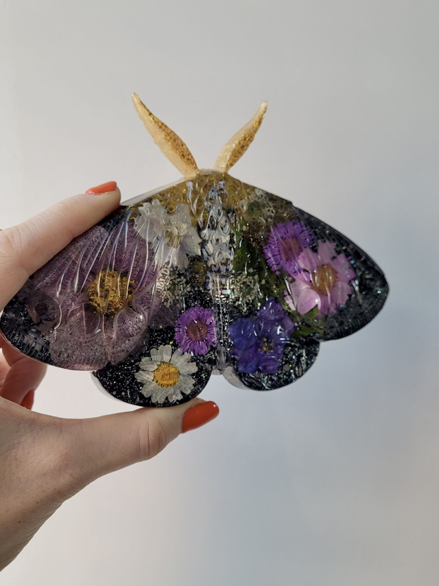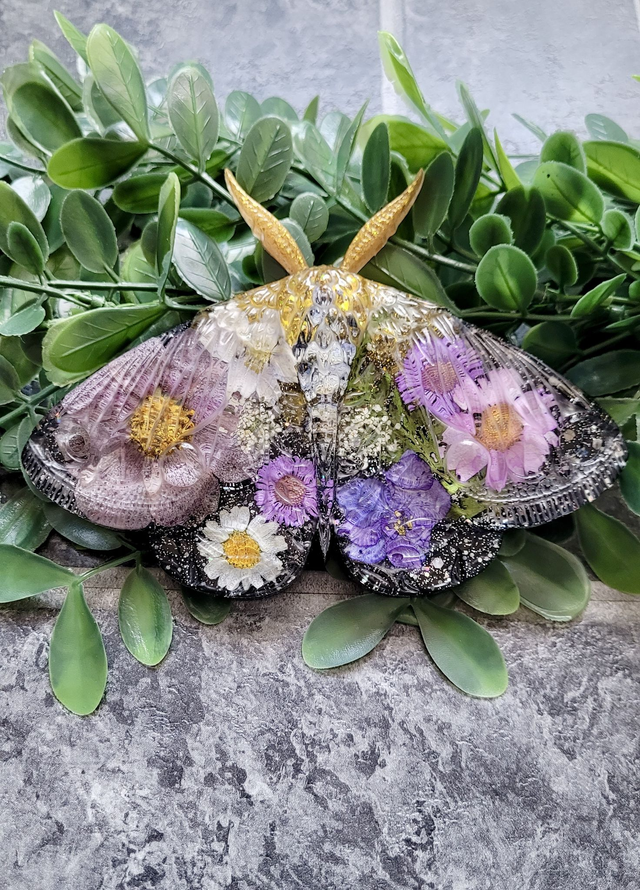 This bold and beautiful resin moth wall hanging is a handmade original, packed with detail and colour. Featuring a galaxy-black glitter base with shimmering sparkles, this statement piece is filled with real dried flowers in vibrant purples, whites, and yellows.