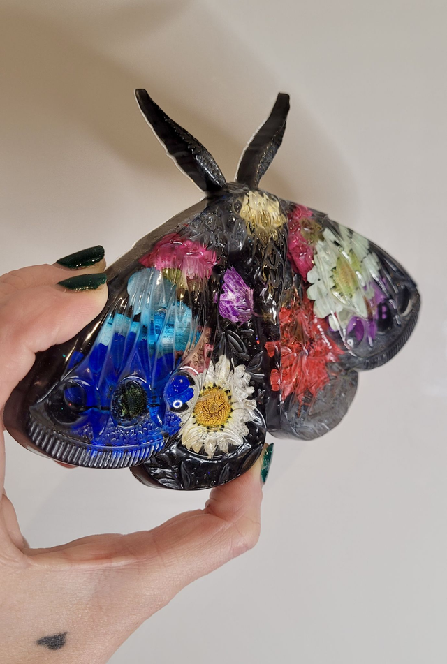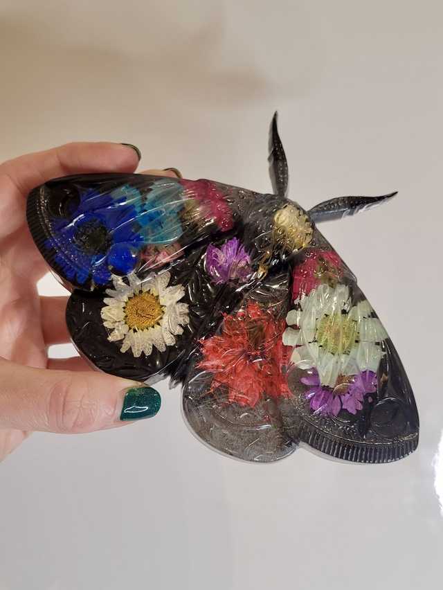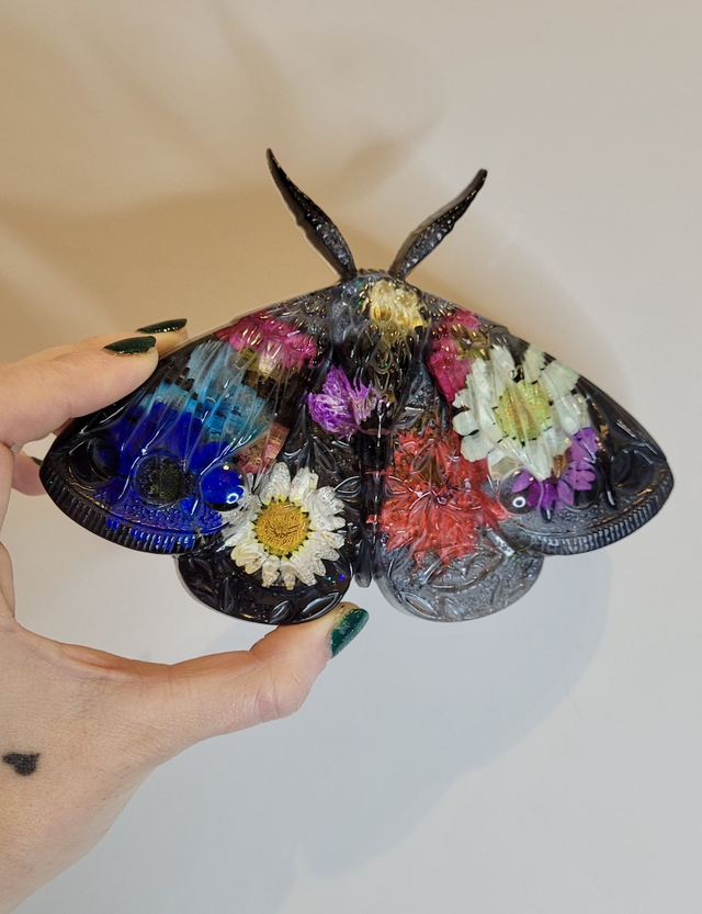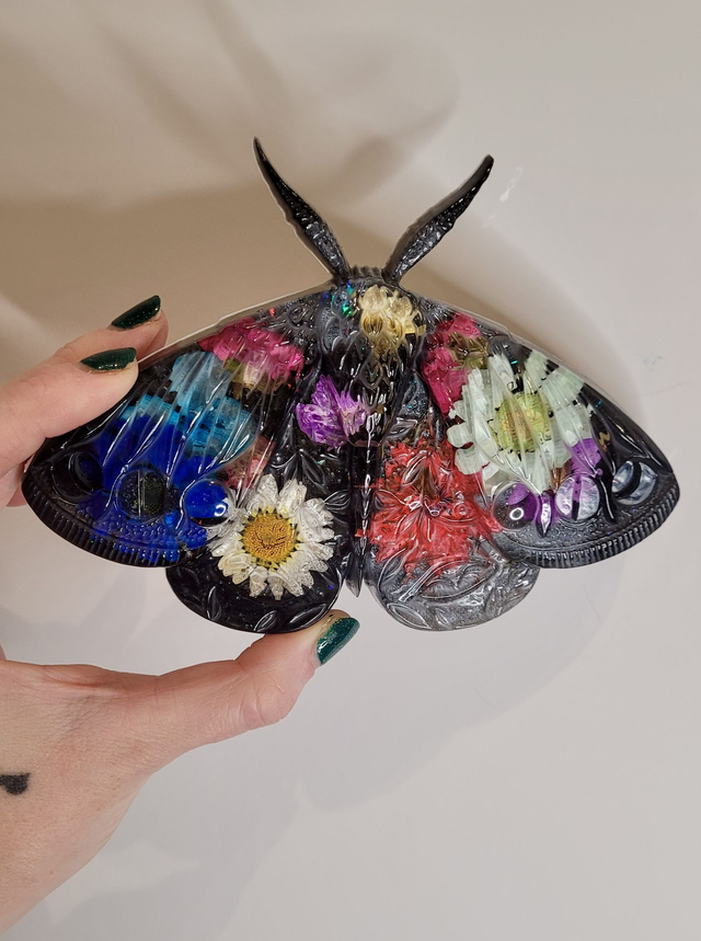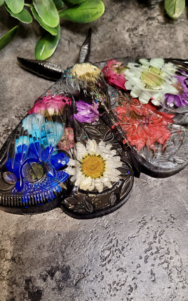 Make a bold statement with this one-of-a-kind resin moth wall hanging, handcrafted with real dried flowers and shimmering pigments. Each wing is packed with vibrant detail – from embedded daisies to multicolour florals – making this a striking centrepiece for any alternative home or gallery wall. Finished with a secure Winsome metal ring for easy hanging.