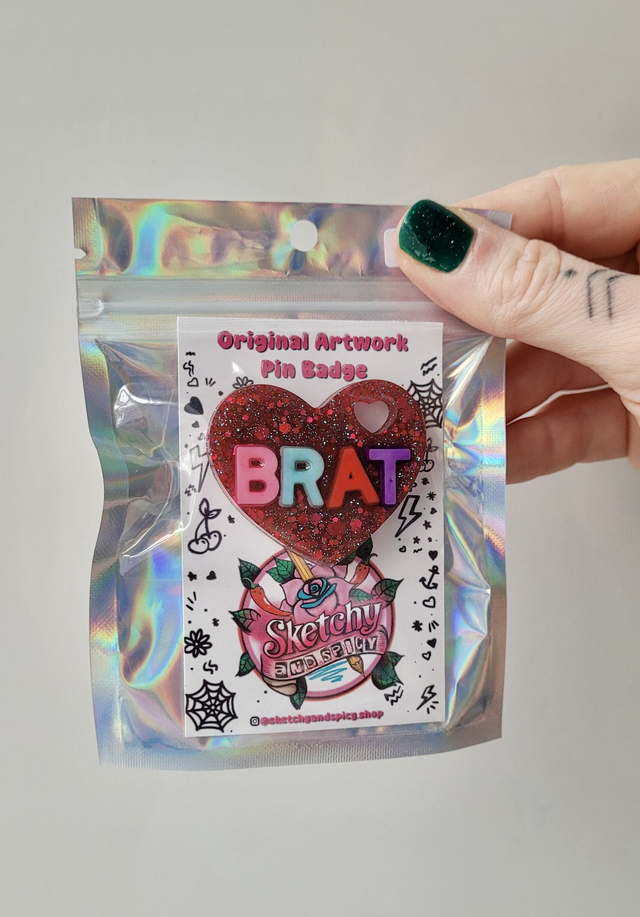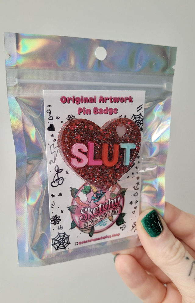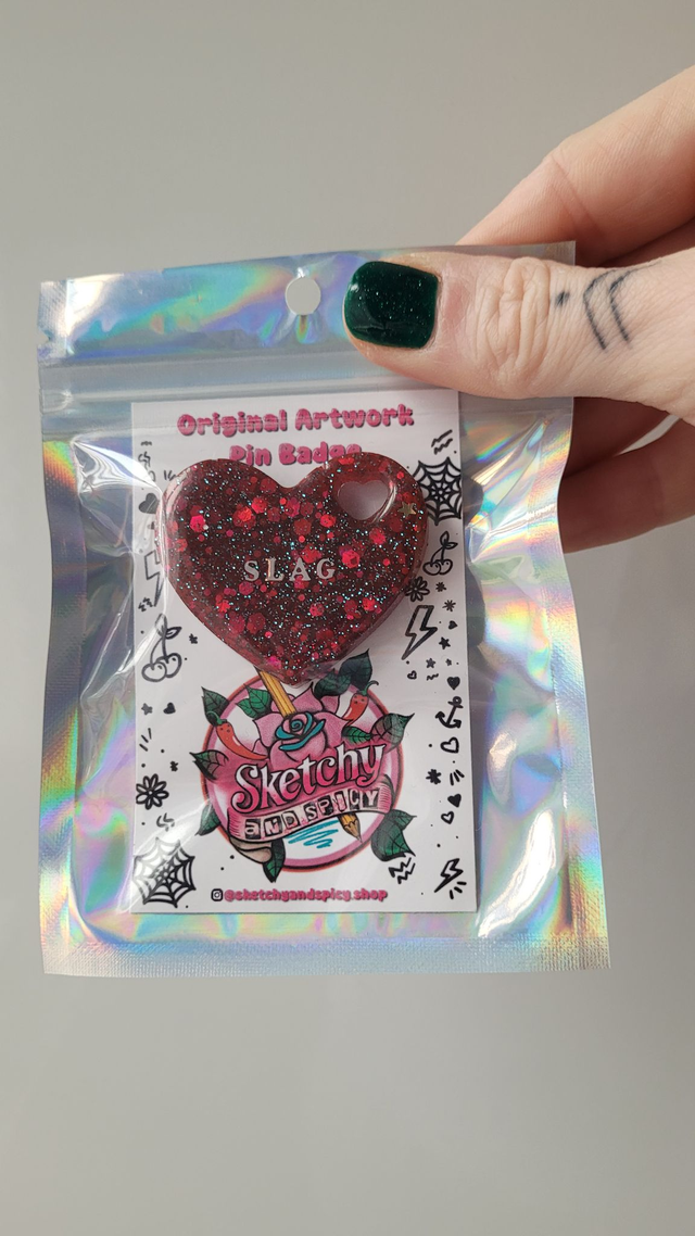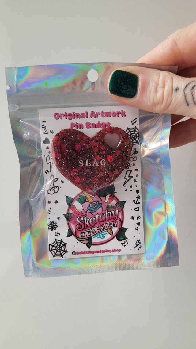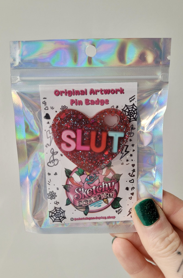 NSFW Handmade Resin Heart Badges - Slut, Slag, Brat Pin Badge