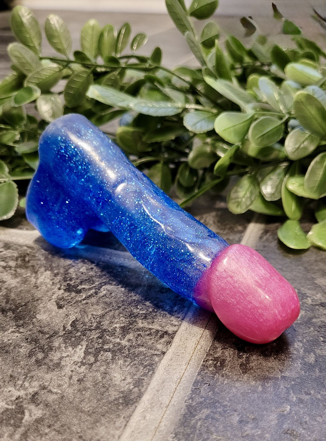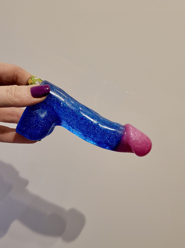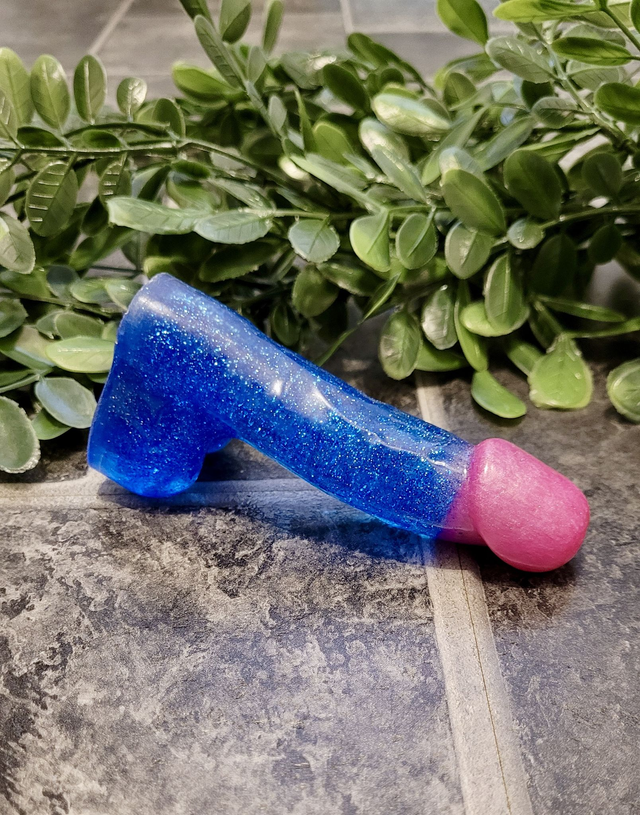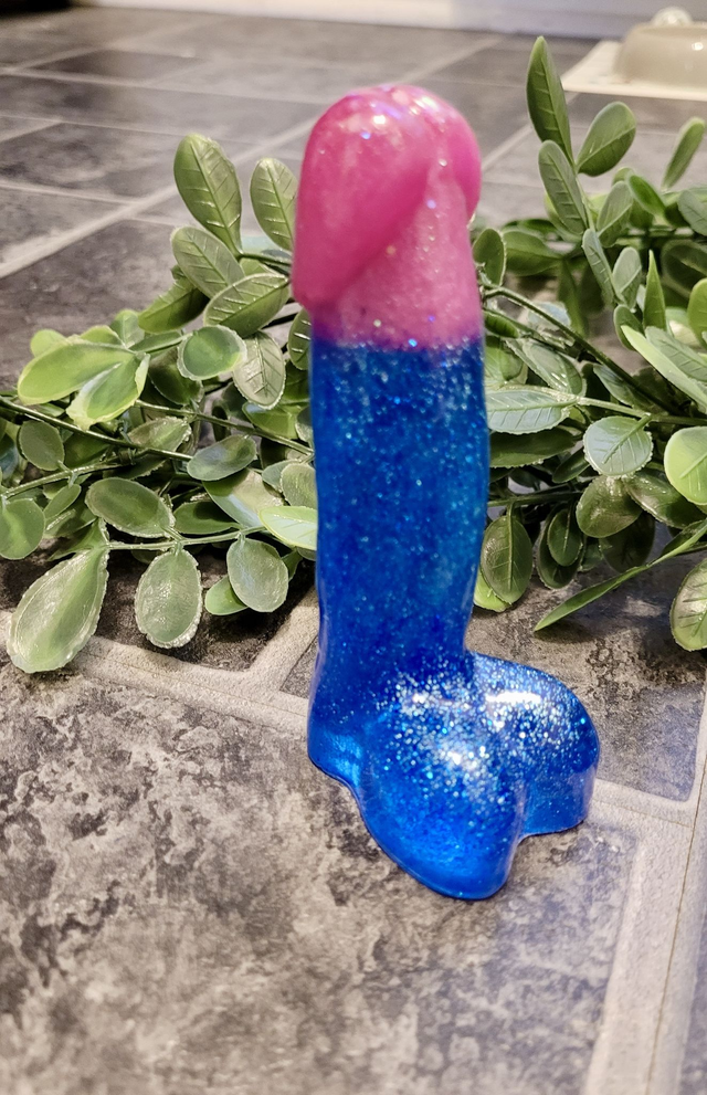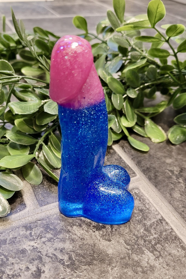 🍆 Add a cheeky splash of glitter to your shelf with this handmade blue and pink resin penis ornament! Inspired by bi-pride colours, this NSFW decor piece is full of queer joy, bold energy, and tongue-in-cheek fun.