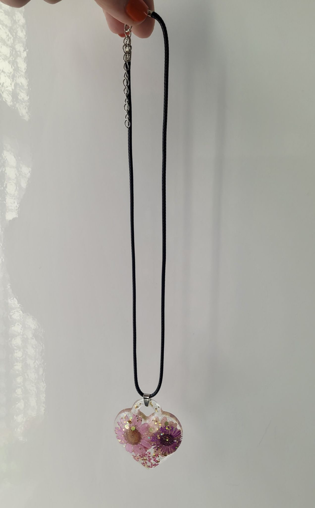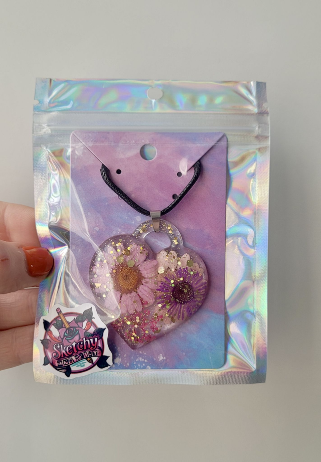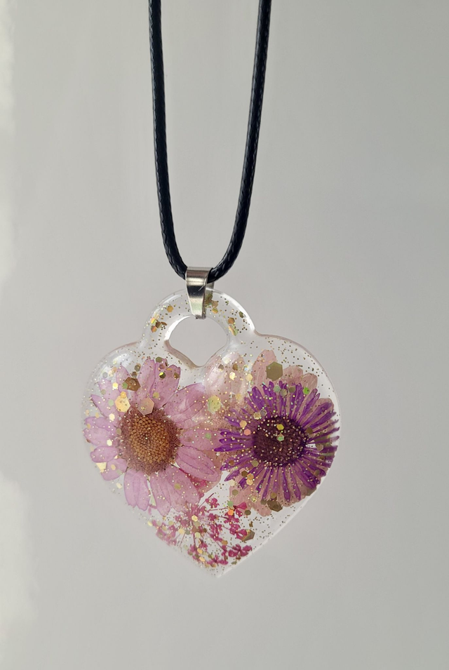 This handmade statement necklace features a chunky clear resin heart filled with real dried pink and purple flowers, golden glitter, and iridescent sparkle. A bold, nature inspired piece that blends delicate botanical beauty with eye catching shine.
