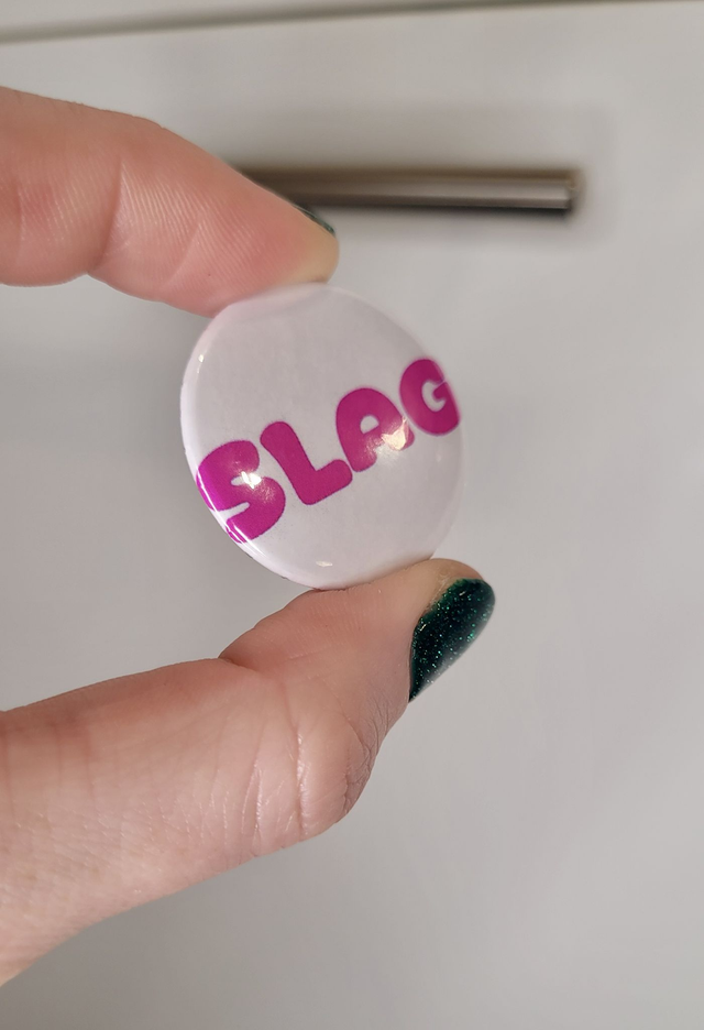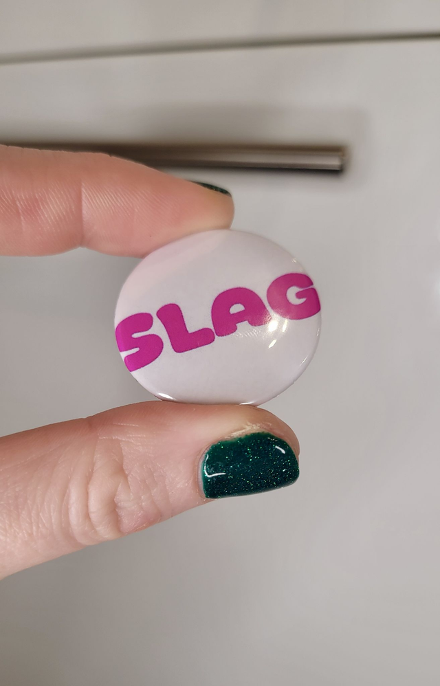 Reclaim the word and wear it with pride! This bold 32mm SLAG badge features hot pink text on a white background in a retro bubble font, giving strong Y2K and camp energy. Lightweight with a white plastic safety pin back, it’s perfect for bags, jackets, dungarees or gifting to your favourite chaotic icon.