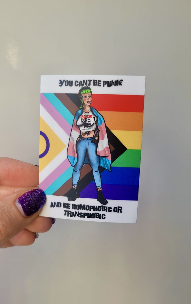 Bold, unapologetic, and proudly inclusive – this punk vinyl sticker features original artwork and a powerful message: You can’t be punk and be homophobic or transphobic. Perfect for laptops, water bottles, notebooks, or wherever you want to make a statement. Glow up from a previous sticker design with added progress pride flag in background.