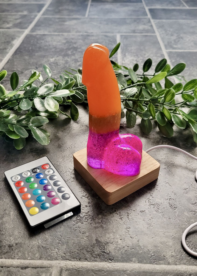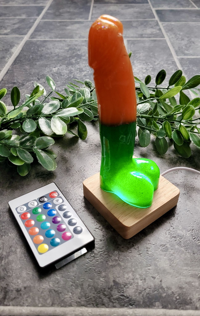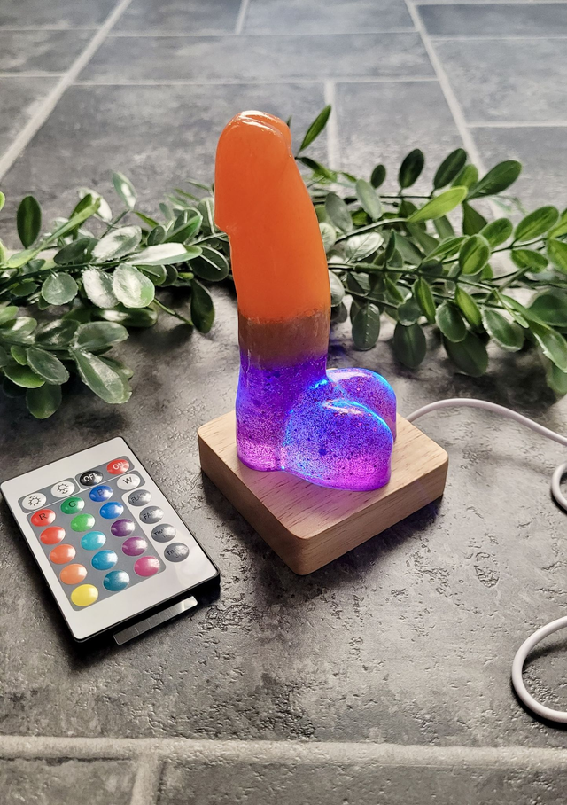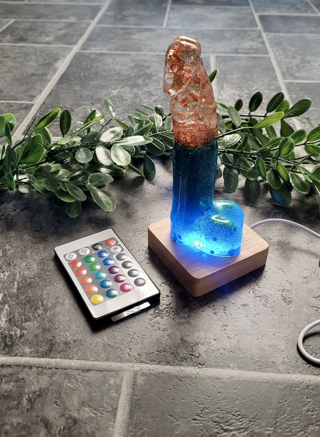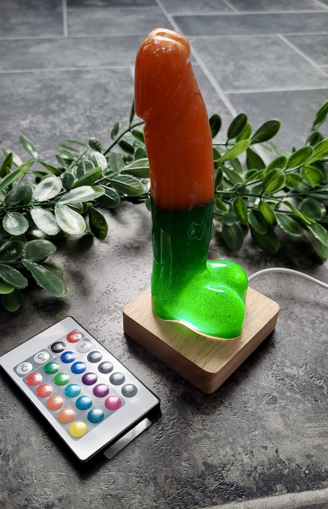 Turn your resin ornament into a glowing statement piece! This wooden LED lamp base features 16 colours and 4 light modes, controlled with the included remote. Perfect as an add-on for Sketchy & Spicy penis ornaments - just pop your piece on top to transform it into a lamp.
