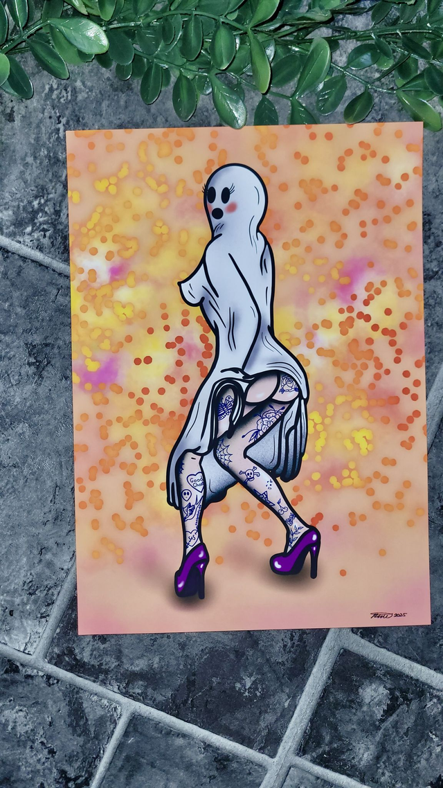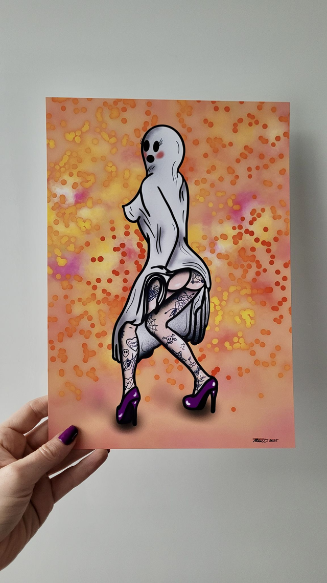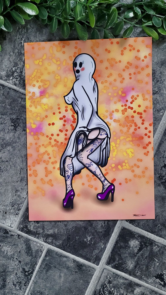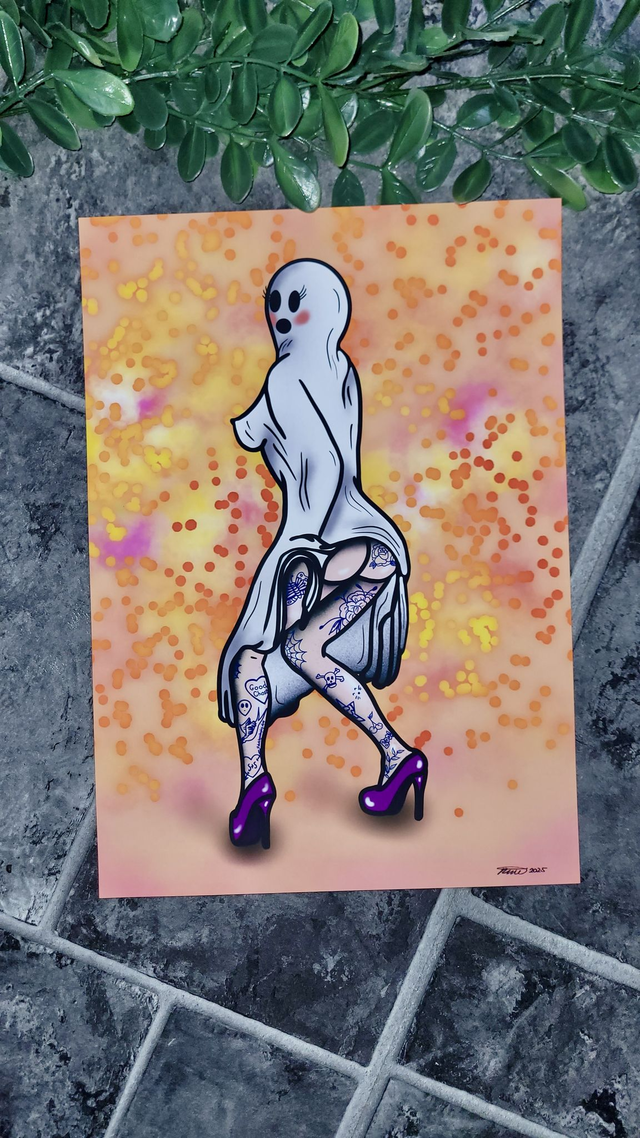Add a touch of spooky sass to your space with this original A4 ghost art print by Sketchy & Spicy. This bold, tattoo-inspired illustration features a cheeky ghost character in high heels with pin-up and Halloween vibes – perfect for gothic, alt, and quirky home decor lovers.