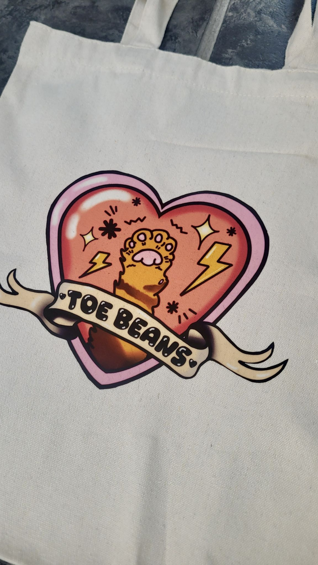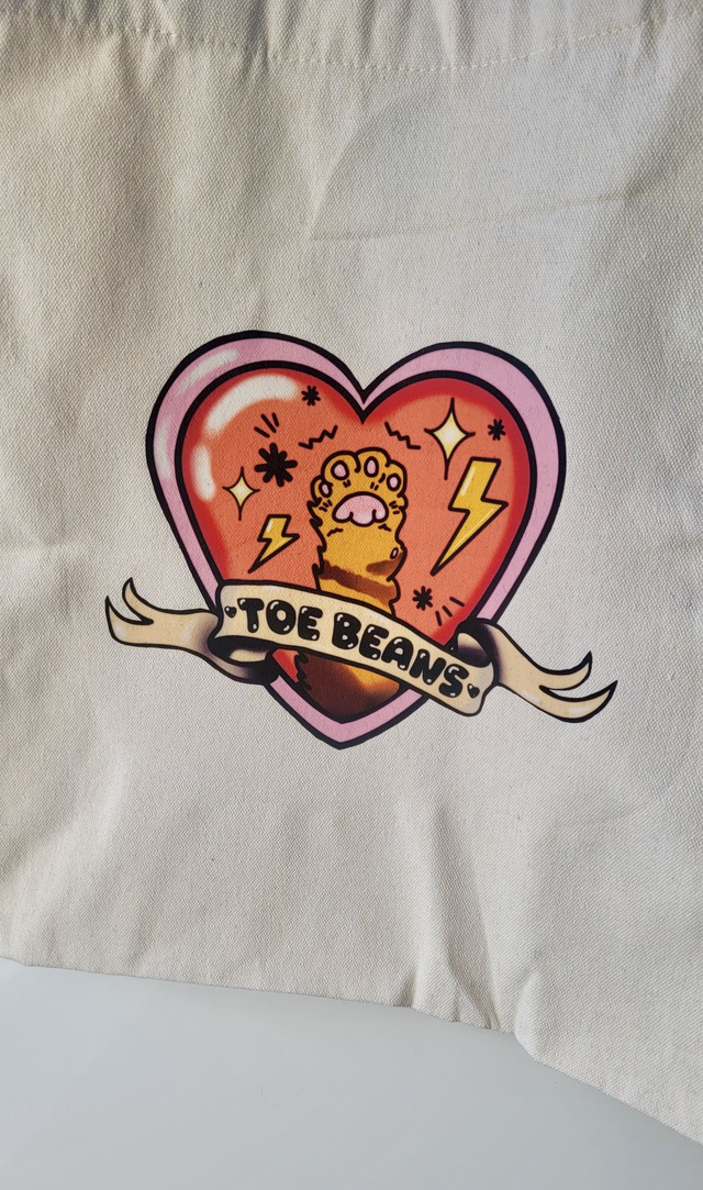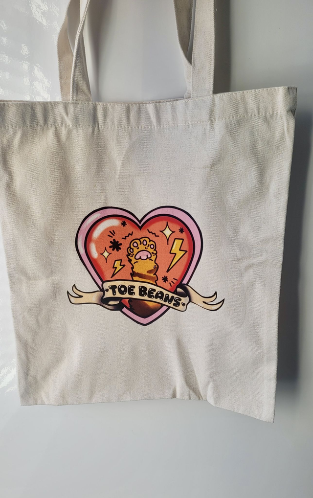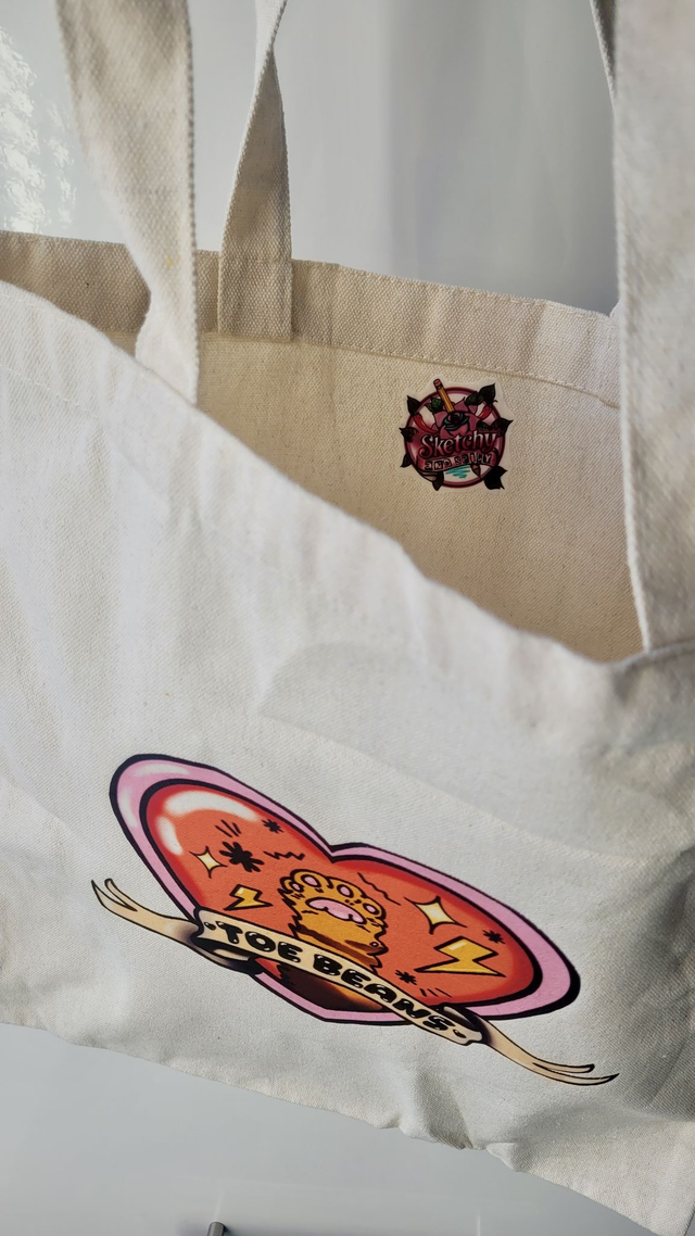 Show your love for toe beans with this bold, beige tote bag featuring original tattoo inspired artwork by Sketchy & Spicy! The design showcases a punky cat paw inside a heart frame with lightning bolts, sparkles, and a scroll banner reading “toe beans.” Perfect for errands, shopping, spooky markets, or everyday alt fashion.