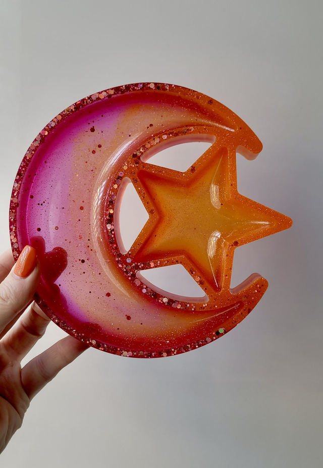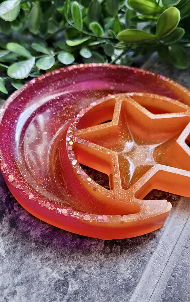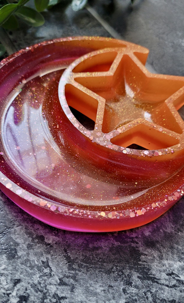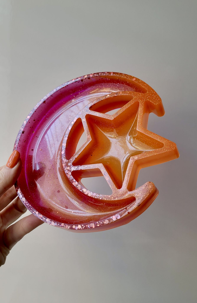 Handmade resin trinket tray featuring a raised crescent moon and star design in swirled pink and orange glitter. Perfect for crystals, jewellery, or witchy home decor.