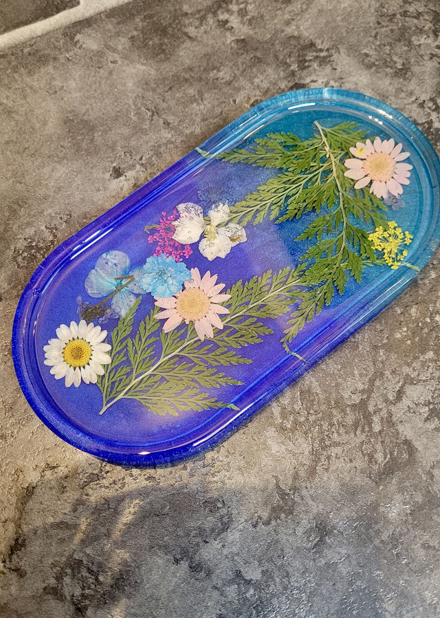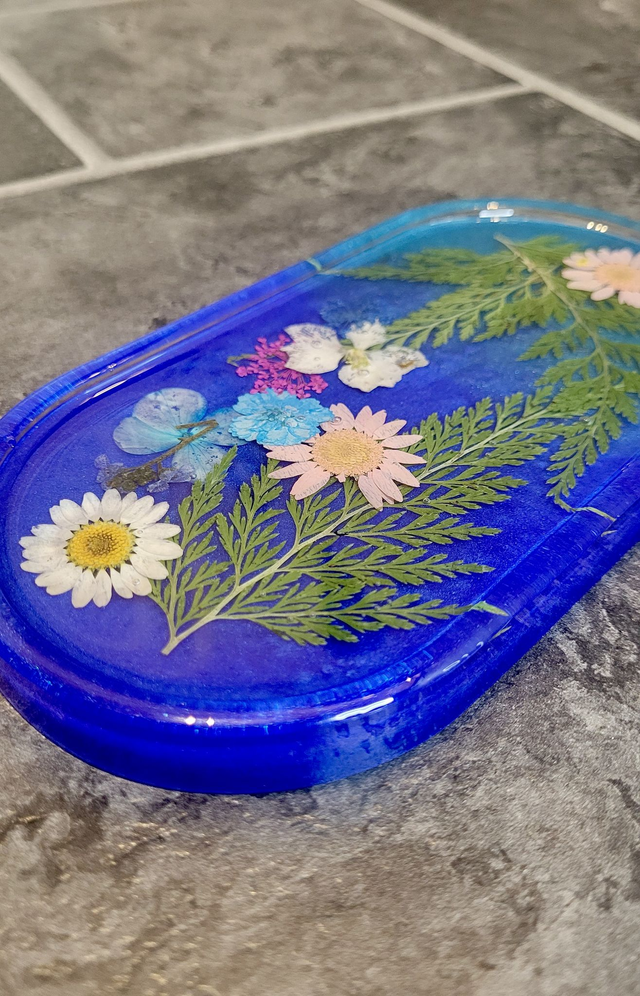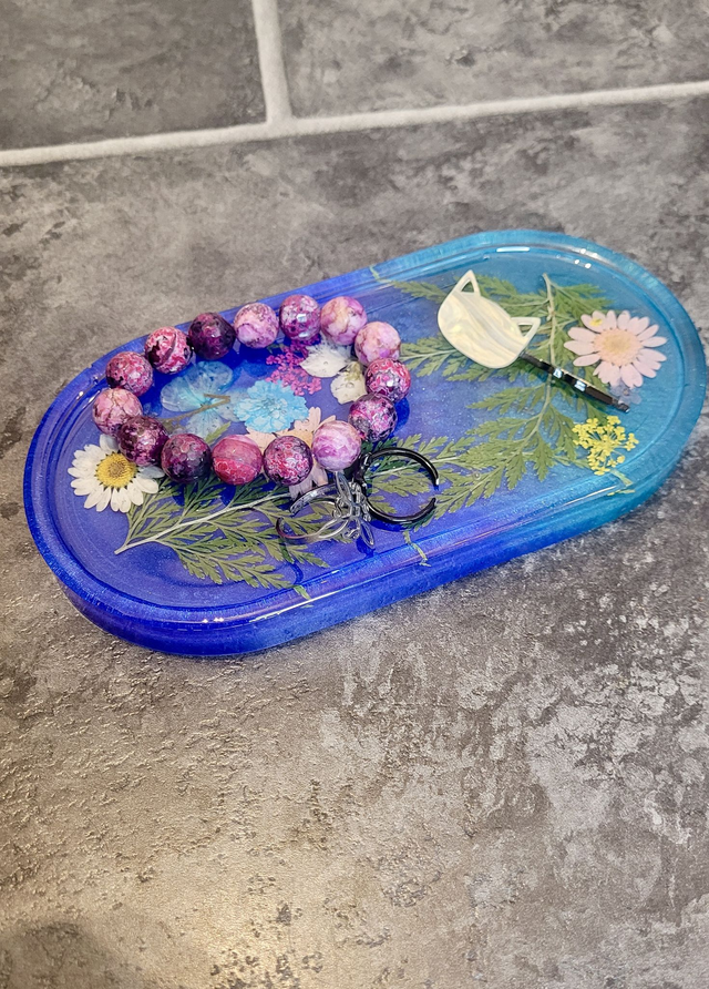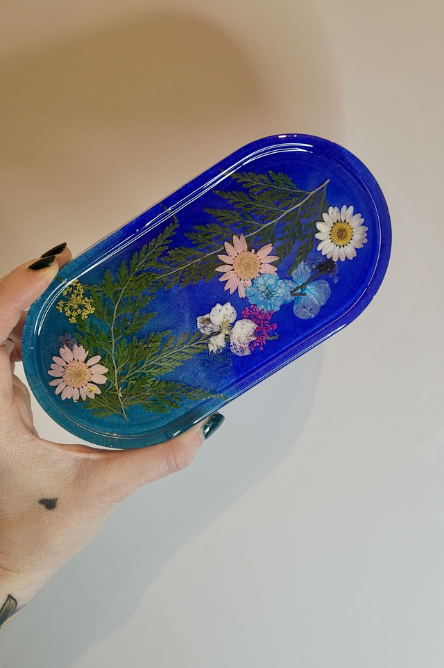 One-of-a-kind handmade trinket tray featuring real dried flowers embedded in a shimmering blue blend resin base. Each flower and fern has been carefully placed by hand, making this a unique decorative piece that’s both functional and beautiful.
